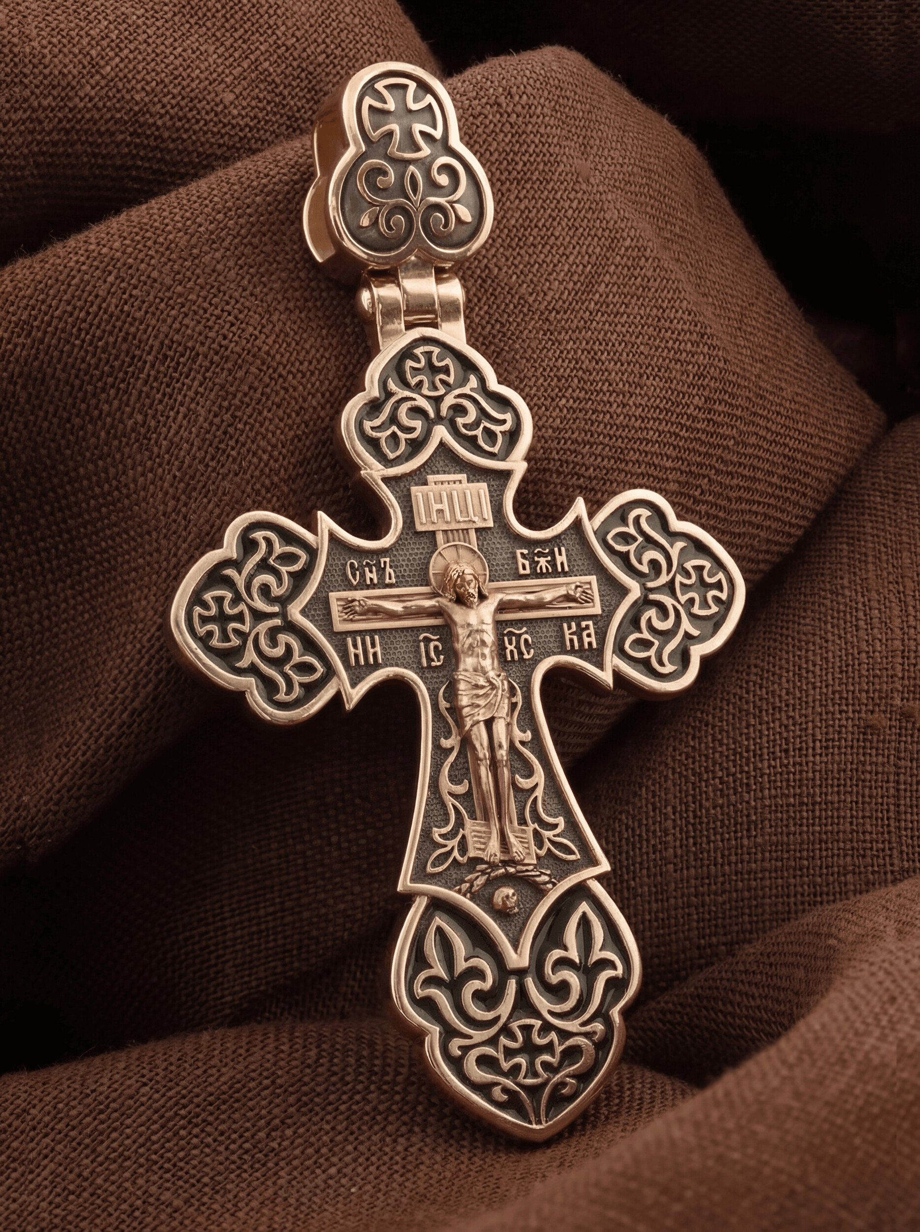 Крест с рельефным изображением Распятия в окружении пышных цветов и ажурного узора, напоминает нам о красоте Райского сада. Такой крест вводит мотив процветшего креста и ассоциируется с образом райского Древа Жизни. Как через древо познания пришла смерть, так через Крест Христа — «Древо Жизни» — даровано спасение.