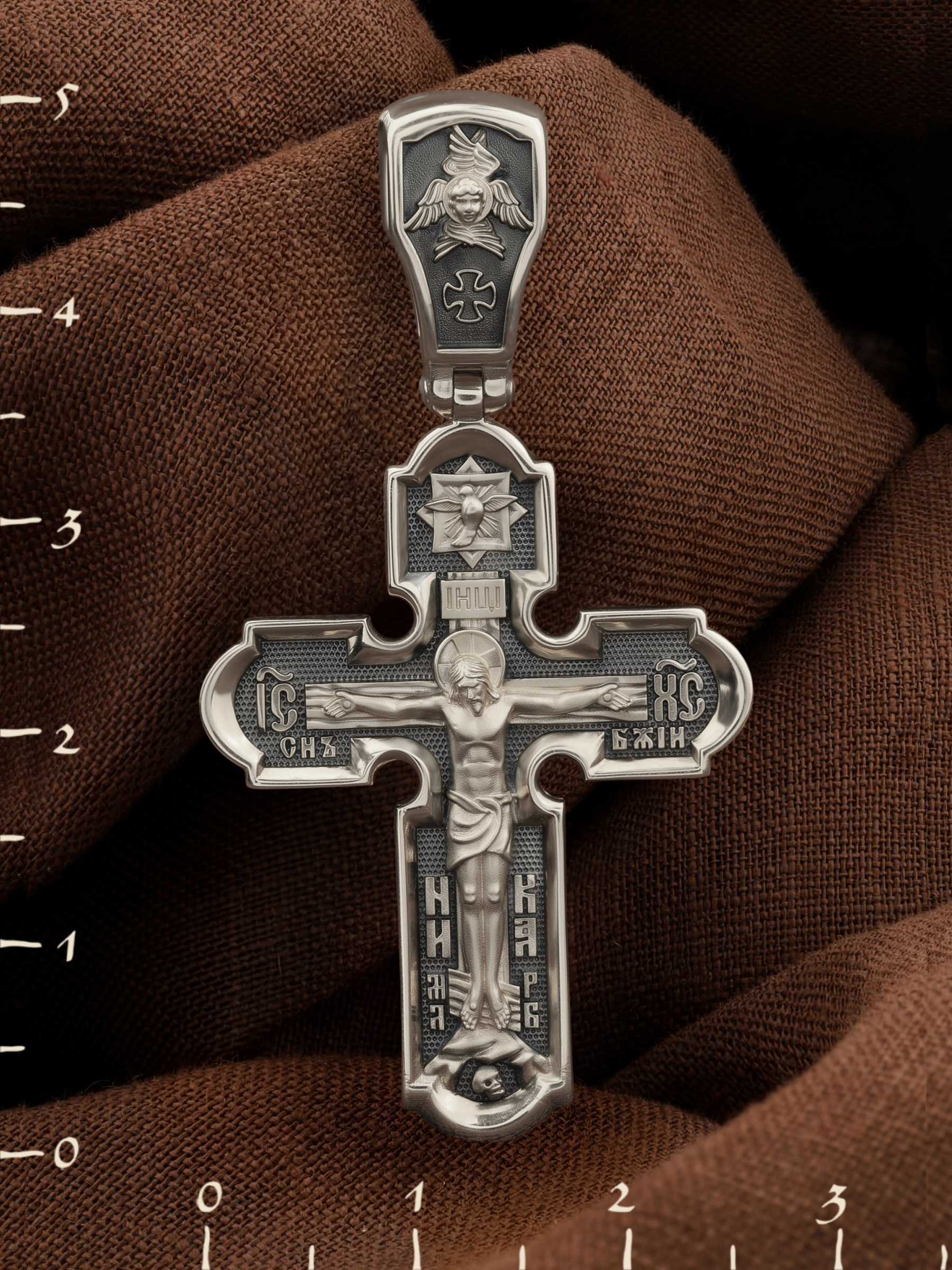 На лицевой стороне креста изображено Распятие Господа и Спасителя нашего Иисуса Христа. Христос, подвергнутый на кресте мучительной казни, своими страданиями искупил нас от древнего греха и даровал нам жизнь вечную. На верхней табличке, выше головы Иисуса, расположена надпись, составленная Понтием Пилатом — «IНЦI». Она означает «Иисус Назорей, Царь Иудейский». Надпись «IС» « ХС» означает Иисус Христос и словосочетание «СЫН БОЖИЙ», что означает божественную природу Иисуса Христа. В нижней части креста находятся надписи «НИКА» и «МЛРБ». В переводе с греческого, слово «НИКА» означает «победитель». Надпись «МЛРБ» — «место лобное рай бысть» — означает, что место лобное стало раем. Крест стоит на горе камней, символизирующих Голгофу. Под подножием Креста изображена покоящаяся голова (череп) Адама.