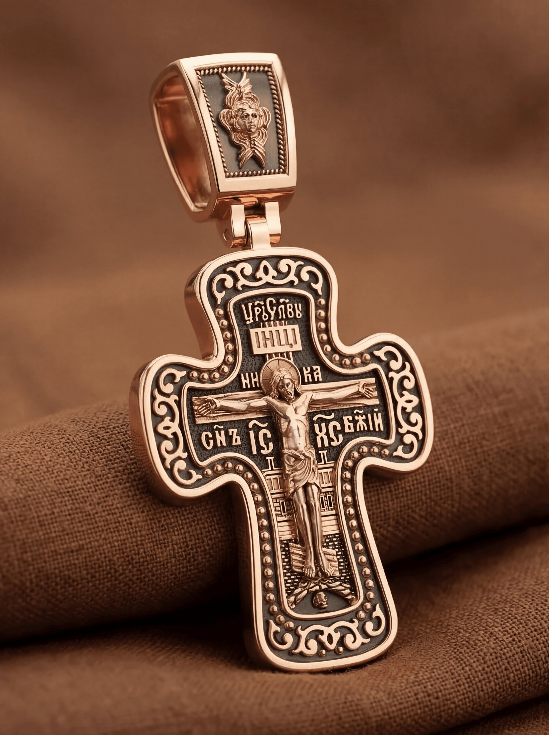 Распятие сопровождается каноническими надписями. Это святое имя Христа, которое принято писать на иконах сокращенно — «ИС ХС», словосочетание «СЫН БОЖИЙ», что означает божественную природу Иисуса Христа. Рядом с Его образом помещены слова «Царь Славы». Над головой Господа на поперечной перекладине аббревиатура «IНЦI», что символизирует табличку, которая была прибита к Кресту, с надписью «Иисус Назорей Царь Иудейский». На кулонном кольце помещено изображение серафима.
