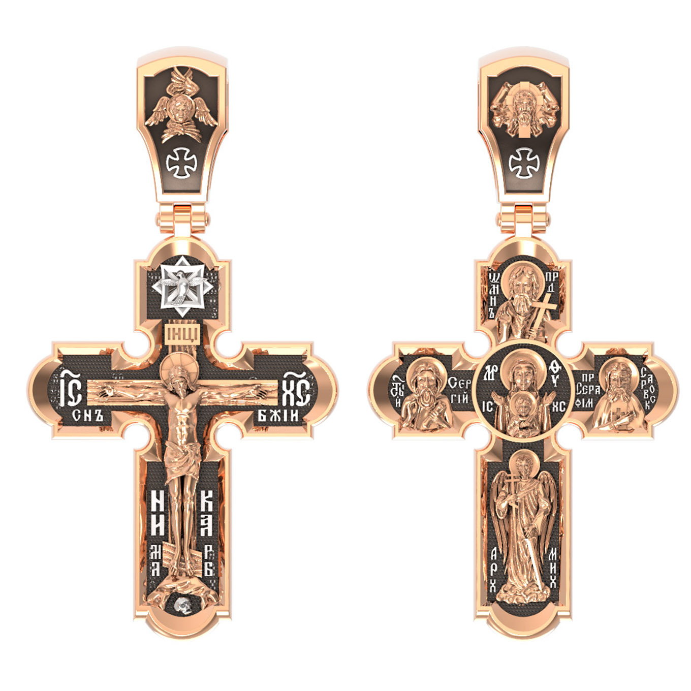 Центральную часть оборотной стороны креста украшает икона Божией Матери «Знамение». Иконы Божией Матери, известные под именем «Знамение», появились на Руси в XI — XII веках, а называться так стали после чудесного знамения от Новгородской иконы, случившегося в 1170 году. Многочисленные списки с иконы Знамения известны по всей России. На кресте внизу изображен Архангел Михаил, слева — Преподобный Сергий Радонежский, справа — Преподобный Серафим Саровский, вверху — Предтеча Господень Иоанн Креститель. На кулонном кольце помещено изображение Спаса Нерукотворного — образ Спасителя, который Он запечатлел на плате и передал для исцеления больному проказой царю Эдессы. Ему придается победное и защитное значение.