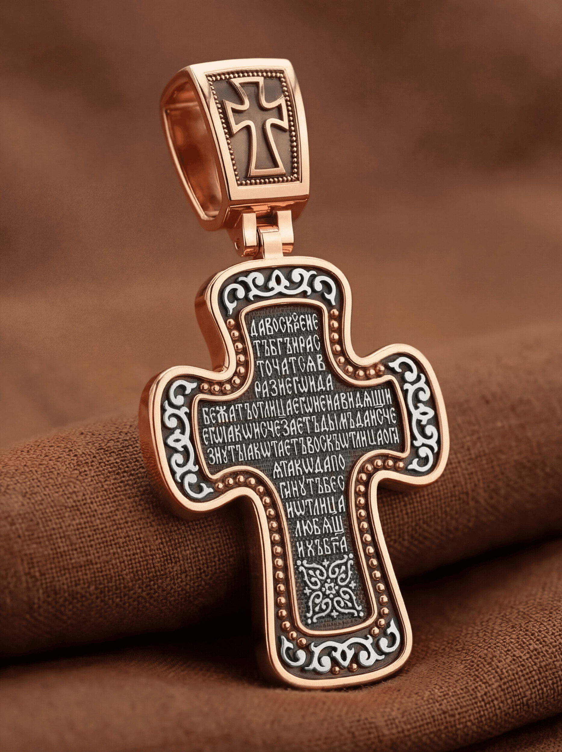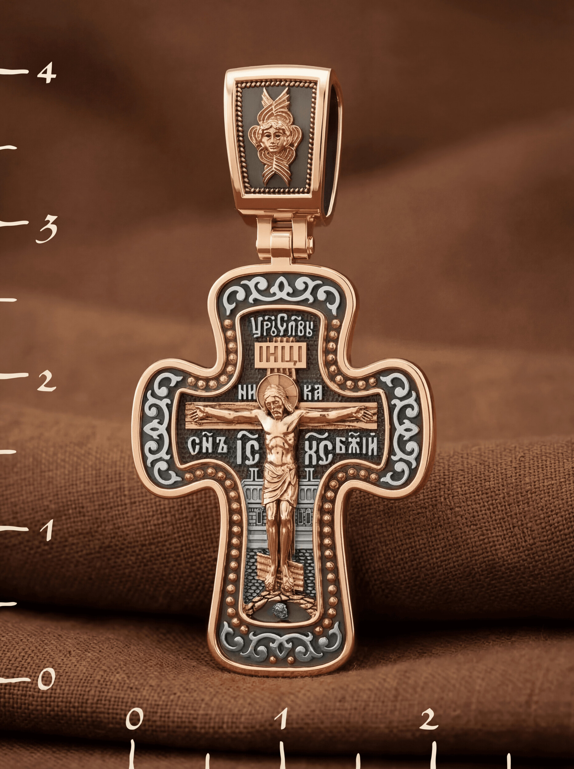 Распятие сопровождается каноническими надписями. Это святое имя Христа, которое принято писать на иконах сокращенно — «ИС ХС», словосочетание «СЫН БОЖИЙ», что означает божественную природу Иисуса Христа. Рядом с Его образом помещены слова «Царь Славы». Над головой Господа на поперечной перекладине аббревиатура «IНЦI», что символизирует табличку, которая была прибита к Кресту, с надписью «Иисус Назорей Царь Иудейский». На кулонном кольце помещено изображение серафима.