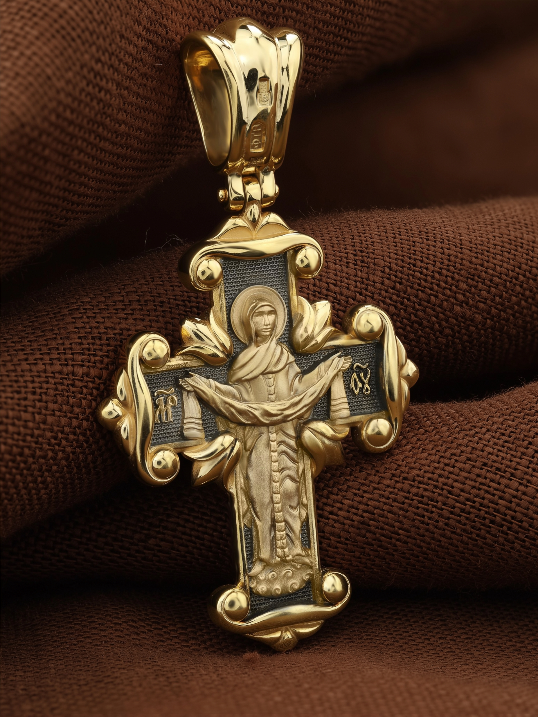 На оборотной стороне креста изображена икона Божией Матери «Покров Пресвятой Богородицы». Праздник Покрова Пресвятой Богородицы пришел на Русь в XII веке из Византии и стал одним из самых почитаемых. В 910 году Византийской Империи угрожали нападением сарацины. Не видя ниоткуда помощи, в те дни греки во множестве стекались в Константинополь, во Влахернский храм, в котором хранились риза Богоматери и Ее головной покров, и молились. 1 (14) октября 910 года Святому Андрею Юродивому и его ученику Епифанию было видение Покрова Божией Матери. Пресвятая Богородица, в окружении Святых, явилась над алтарем Храма и слезно молилась. По окончании молитвы сняла с Себя блистающее великое и страшное покрывало, которое носила на Пречистой главе Своей и, держа его с великой торжественностью, распростерла над всем стоящим народом. Вскоре враги без всякого кровопролития отступили от города. Богородица простирает Свой молитвенный покров над всеми православными христианами и умоляет Сына своего о даровании вечного спасения каждому человеку.