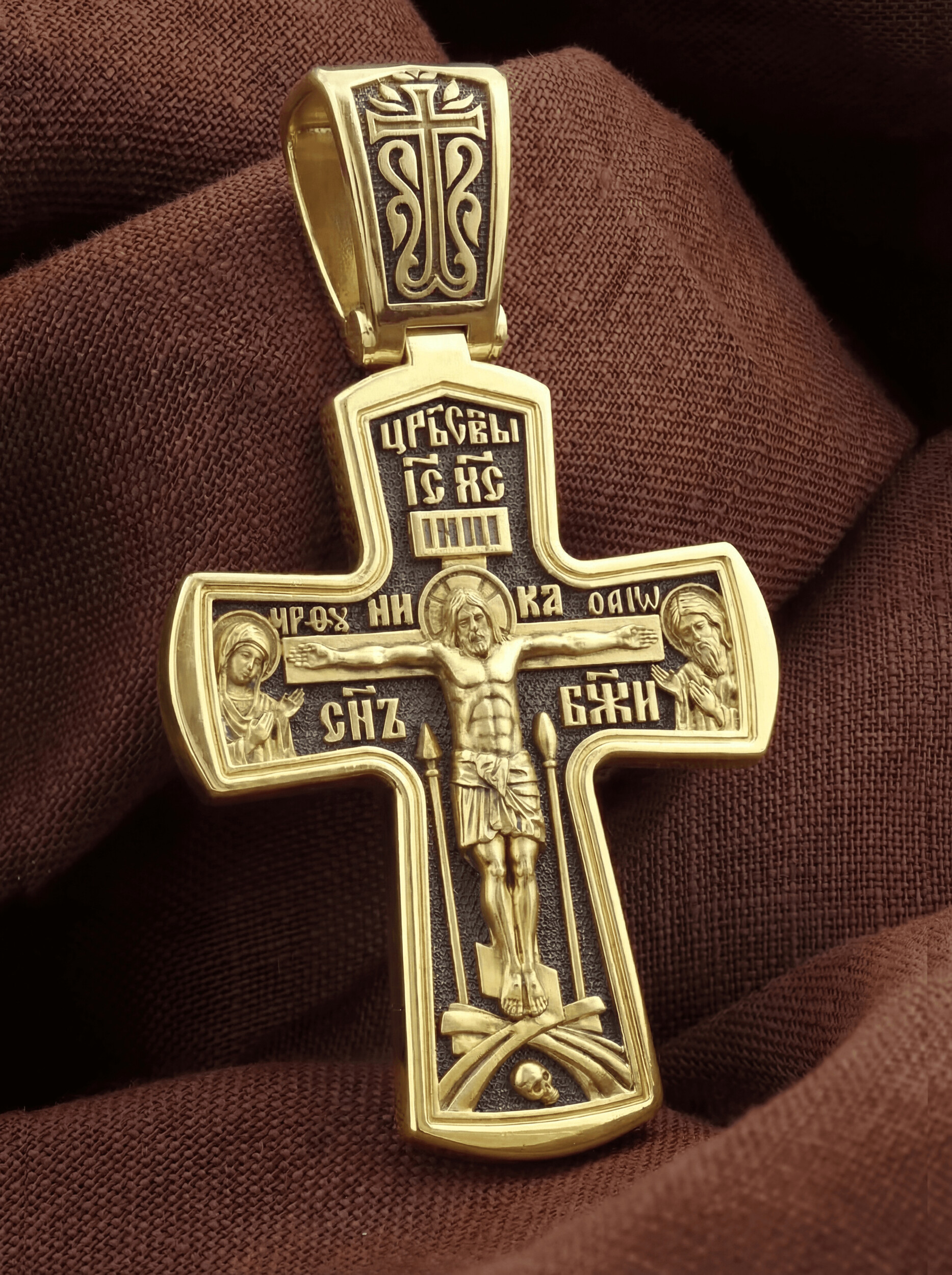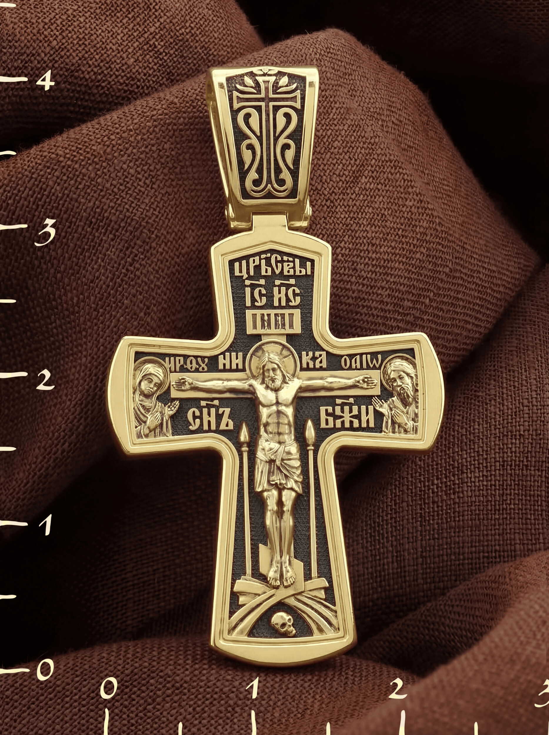 На лицевой стороне креста изображено Распятие Господа и Спасителя нашего Иисуса Христа, отдавшего Себя на смерть, для искупления грехов мира. Крест является символом жертвенной любви Всеблагого Бога к падшим людям, всепобеждающим духовным оружием христиан, основанием и средоточием церковной жизни. Господь сказал: «кто хочет идти за Мною, отвергнись себя, и возьми крест свой, и следуй за Мною». (Мк. 8: 34). На кулонном кольце изображен процветший крест. На верхней табличке, выше головы Иисуса, расположена надпись, составленная Понтием Пилатом — «IНЦI». Она означает «Иисус Назорей, Царь Иудейский». Распятие сопровождается каноническими надписями. Выше Распятия помещена надпись «Царь Славы» и надпись «IC» «ХC», означает Иисус Христос. Слово «НИКА», что означает «победитель» и надпись «Сын Божий», что означает божественную природу Иисуса Христа, помещаются на разных сторонах поперечной перекладины креста. Слева от Распятия изображена Пресвятая Богородица, справа — Про¬рок Предтеча и Креститель Господень Иоанн. Вдоль креста помещены Орудия Страстей Господних — копие сотника Лонгина и трость с губкой. Крест стоит на горе камней, символизирующих Голгофу. В ее основании различается череп– это голова Адама. На православном кресте Христос не умирает, а свободно простирает руки, ладони Иисуса открыты, будто он хочет обнять все человечество, даря им свою любовь и открывая путь к вечной жизни.