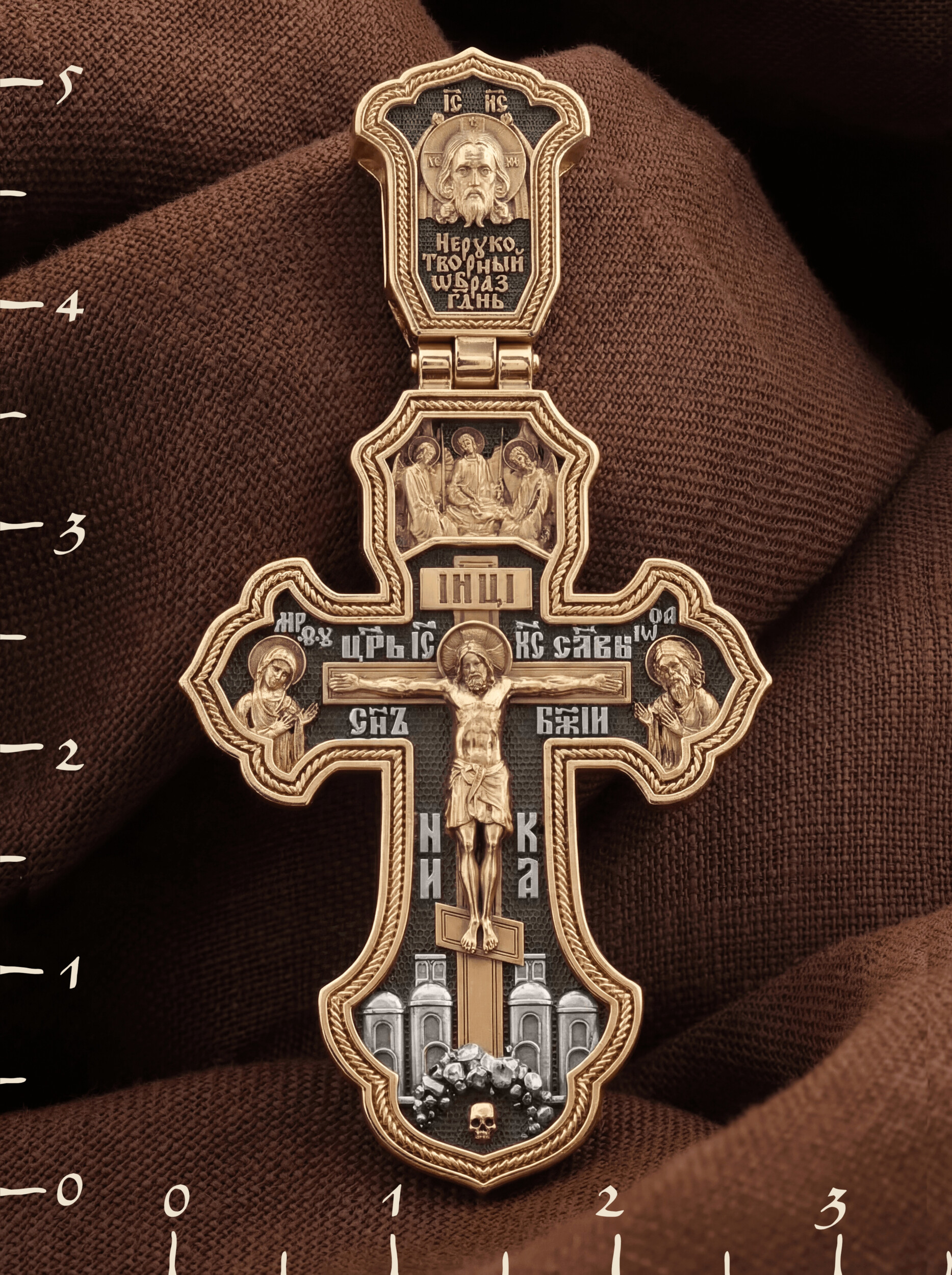 На лицевой стороне креста изображено Распятие Господа и Спасителя нашего Иисуса Христа, отдавшего Себя на смерть, для искупления грехов мира. Крест является символом жертвенной любви Всеблагого Бога к падшим людям, всепобеждающим духовным оружием христиан, основанием и средоточием церковной жизни. Господь сказал: кто хочет идти за Мною, отвергнись себя, и возьми крест свой, и следуй за Мною. (Мк. 8: 34). Над распятием помещена икона Святой Троицы, написанная преподобным Андреем Рублёвым в XV веке. На иконе изображены три ангела, являющихся образом Единосущного и Триипостасного Бога — Святой Троицы. На кулонном кольце изображен Нерукотворный образ Господа и Спасителя нашего Иисуса Христа. На верхней табличке, выше головы Иисуса, расположена надпись, составленная Понтием Пилатом — «IНЦI». Она означает «Иисус Назорей, Царь Иудейский». Надпись «IC» «ХC», означает Иисус Христос, помещается на разных сторонах поперечной перекладины креста. Рядом — слово «НИКА», что означает «победитель» и надпись «Царь Славы». Слева от Распятия изображена Пресвятая Богородица, справа — Про-рок Предтеча и Креститель Господень Иоанн. Ниже расположена надпись «Сын Божий». За крестом высится Иерусалимская стена, в знак того, что Господь был распят вне стен города. Крест стоит на горе камней, символизирующих Голгофу. В ее основании различается череп– это голова Адама.