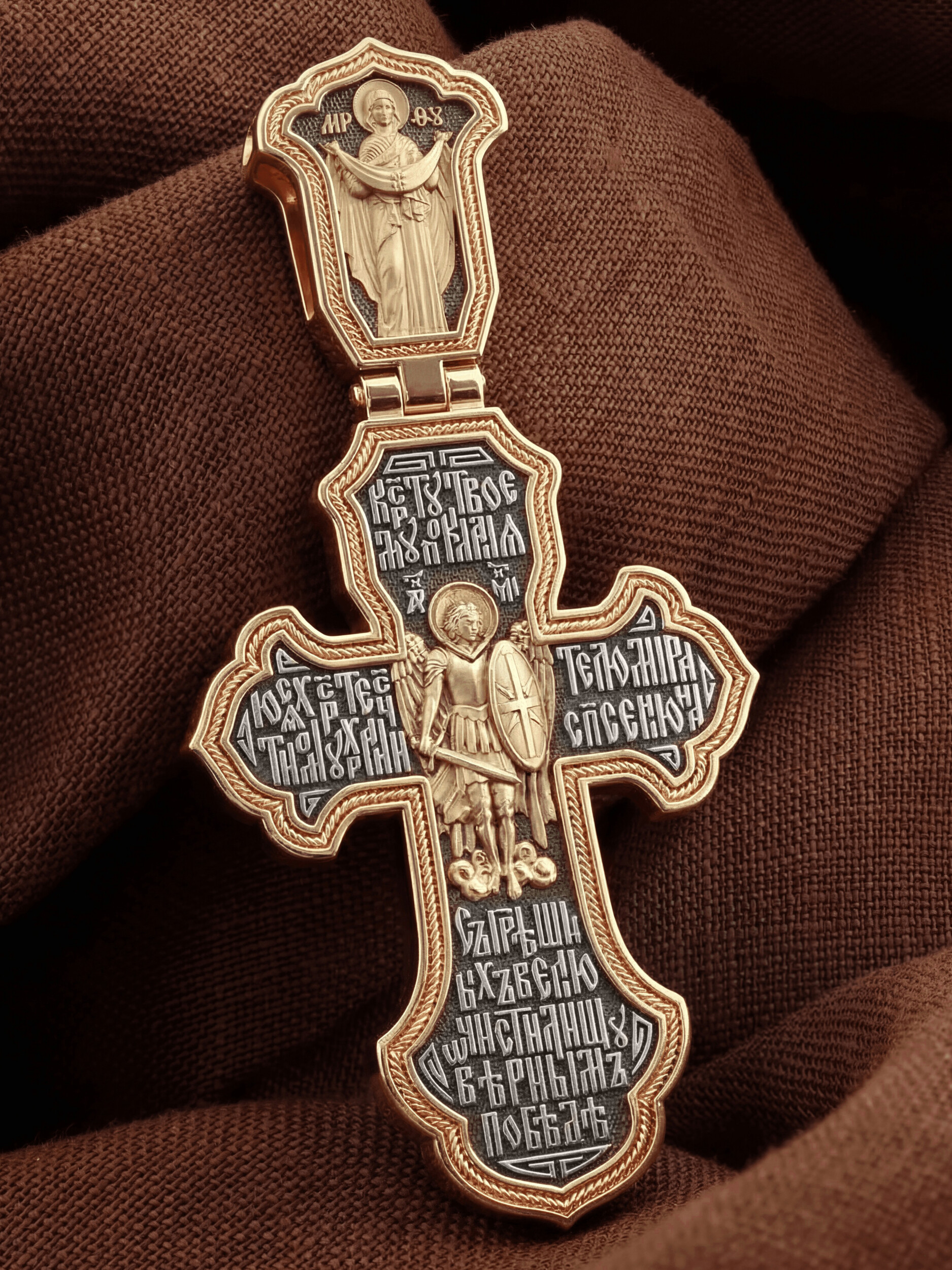 В центре оборотной стороне креста помещен образ Архангела Михаила — верного служителя Божия, который низринул с Неба возгордившегося денницу с другими павшими духами. Он изображен в воинственном виде с огненным мечом в правой руке и щитом в левой. В Православии его называют Архистратигом, что означает глава святого воинства Ангелов и Архангелов. Вокруг образа размещена молитва: «Кресту твоему поклоняемся, Христе, честному хранителю мира, спасения нас грешных, велию очистилищу, верным победе». На кулонной кольце изображена икона Божией Матери «Покров Пресвятой Богородицы». Праздник Покрова Пресвятой Богородицы пришел на Русь в XII веке из Византии и стал одним из самых почитаемых. Богородица простирает Свой молитвенный покров над всеми православными христианами и умоляет Сына своего о даровании вечного спасения каждому человеку.