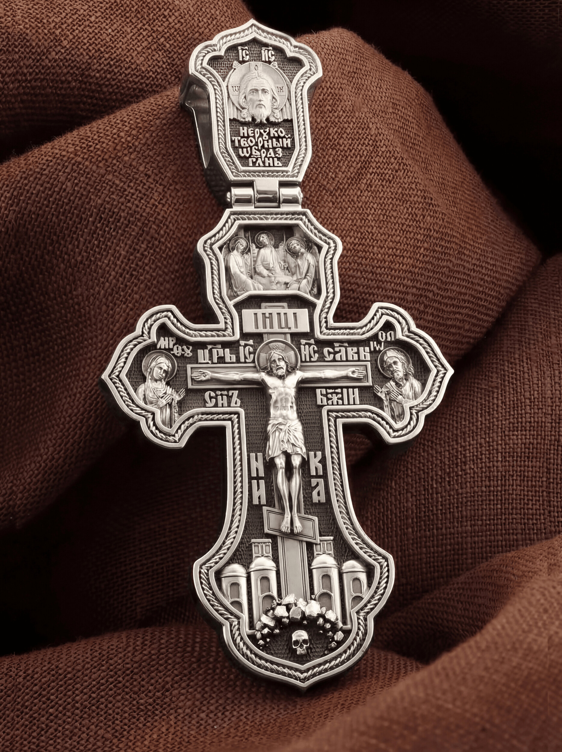 На лицевой стороне креста изображено Распятие Господа и Спасителя нашего Иисуса Христа, отдавшего Себя на смерть, для искупления грехов мира. Крест является символом жертвенной любви Всеблагого Бога к падшим людям, всепобеждающим духовным оружием христиан, основанием и средоточием церковной жизни. Господь сказал: кто хочет идти за Мною, отвергнись себя, и возьми крест свой, и следуй за Мною. (Мк. 8: 34). Над распятием помещена икона Святой Троицы, написанная преподобным Андреем Рублёвым в XV веке. На иконе изображены три ангела, являющихся образом Единосущного и Триипостасного Бога — Святой Троицы. На кулонном кольце изображен Нерукотворный образ Господа и Спасителя нашего Иисуса Христа. На верхней табличке, выше головы Иисуса, расположена надпись, составленная Понтием Пилатом — «IНЦI». Она означает «Иисус Назорей, Царь Иудейский». Надпись «IC» «ХC», означает Иисус Христос, помещается на разных сторонах поперечной перекладины креста. Рядом — слово «НИКА», что означает «победитель» и надпись «Царь Славы». Слева от Распятия изображена Пресвятая Богородица, справа — Про-рок Предтеча и Креститель Господень Иоанн. Ниже расположена надпись «Сын Божий». За крестом высится Иерусалимская стена, в знак того, что Господь был распят вне стен города. Крест стоит на горе камней, символизирующих Голгофу. В ее основании различается череп– это голова Адама.