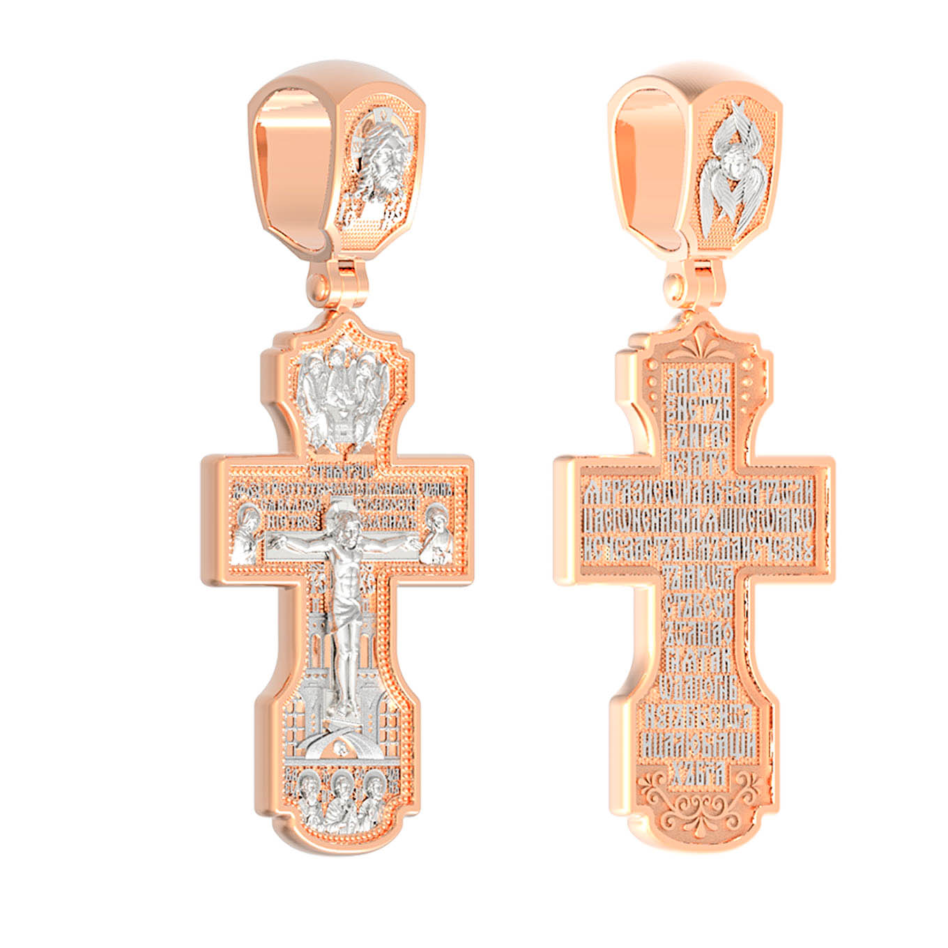 На лицевой стороне креста изображено Распятие Господа и Спасителя нашего Иисуса Христа, отдавшего Себя на смерть, для искупления грехов мира. Крест является символом жертвенной любви Всеблагого Бога к падшим людям, всепобеждающим духовным оружием христиан, основанием и средоточием церковной жизни. Господь сказал: «кто хочет идти за Мною, отвергнись себя, и возьми крест свой, и следуй за Мною». (Мк. 8: 34). Выше Распятия помещены слова молитвы:"Кресту Твоему поклоняемся, Владыко, и святое Воскресение Твое Славим». Над Распятием — образ Святой Троицы в виде трех ангелов. Надпись «IС» « ХС» означает Иисус Христос и находится ниже поперечной перекладины креста. Слева от Распятия изображена Пресвятая Богородица. Справа — апостол и евангелист Иоанн Богослов, один из ближайших учеников Иисуса Христа. За крестом высится Иерусалимская стена. Крест стоит на горе камней, символизирующих Голгофу. В ее основании различается череп — это голова Адама. Ниже распятия изображены отцы Церкви — Святители Василий Великий, Григорий Богослов и Иоанн Златоуст. На православном кресте Христос не умирает, а свободно простирает руки, ладони Иисуса открыты, будто он хочет обнять все человечество, даря им свою любовь и открывая путь к вечной жизни. На кулонном кольце изображен Нерукотворный образ Господа и Спасителя нашего Иисуса Христа, чудесно отпечатавшийся на плате, которым Христос вытер свой лик.
