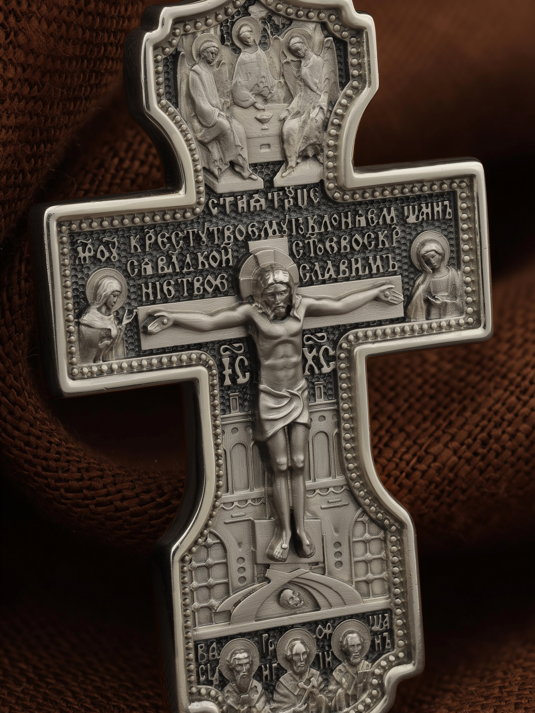 На лицевой стороне креста изображено Распятие Господа и Спасителя нашего Иисуса Христа, отдавшего Себя на смерть, для искупления грехов мира. Крест является символом жертвенной любви Всеблагого Бога к падшим людям, всепобеждающим духовным оружием христиан, основанием и средоточием церковной жизни. Господь сказал: «кто хочет идти за Мною, отвергнись себя, и возьми крест свой, и следуй за Мною». (Мк. 8: 34). Выше Распятия помещены слова молитвы:"Кресту Твоему поклоняемся, Владыко, и святое Воскресение Твое Славим». Над Распятием — образ Святой Троицы в виде трех ангелов. Надпись «IС» « ХС» означает Иисус Христос и находится ниже поперечной перекладины креста. Слева от Распятия изображена Пресвятая Богородица. Справа — апостол и евангелист Иоанн Богослов, один из ближайших учеников Иисуса Христа. За крестом высится Иерусалимская стена. Крест стоит на горе камней, символизирующих Голгофу. В ее основании различается череп — это голова Адама. Ниже распятия изображены отцы Церкви — Святители Василий Великий, Григорий Богослов и Иоанн Златоуст. На православном кресте Христос не умирает, а свободно простирает руки, ладони Иисуса открыты, будто он хочет обнять все человечество, даря им свою любовь и открывая путь к вечной жизни. На кулонном кольце изображен Нерукотворный образ Господа и Спасителя нашего Иисуса Христа, чудесно отпечатавшийся на плате, которым Христос вытер свой лик.