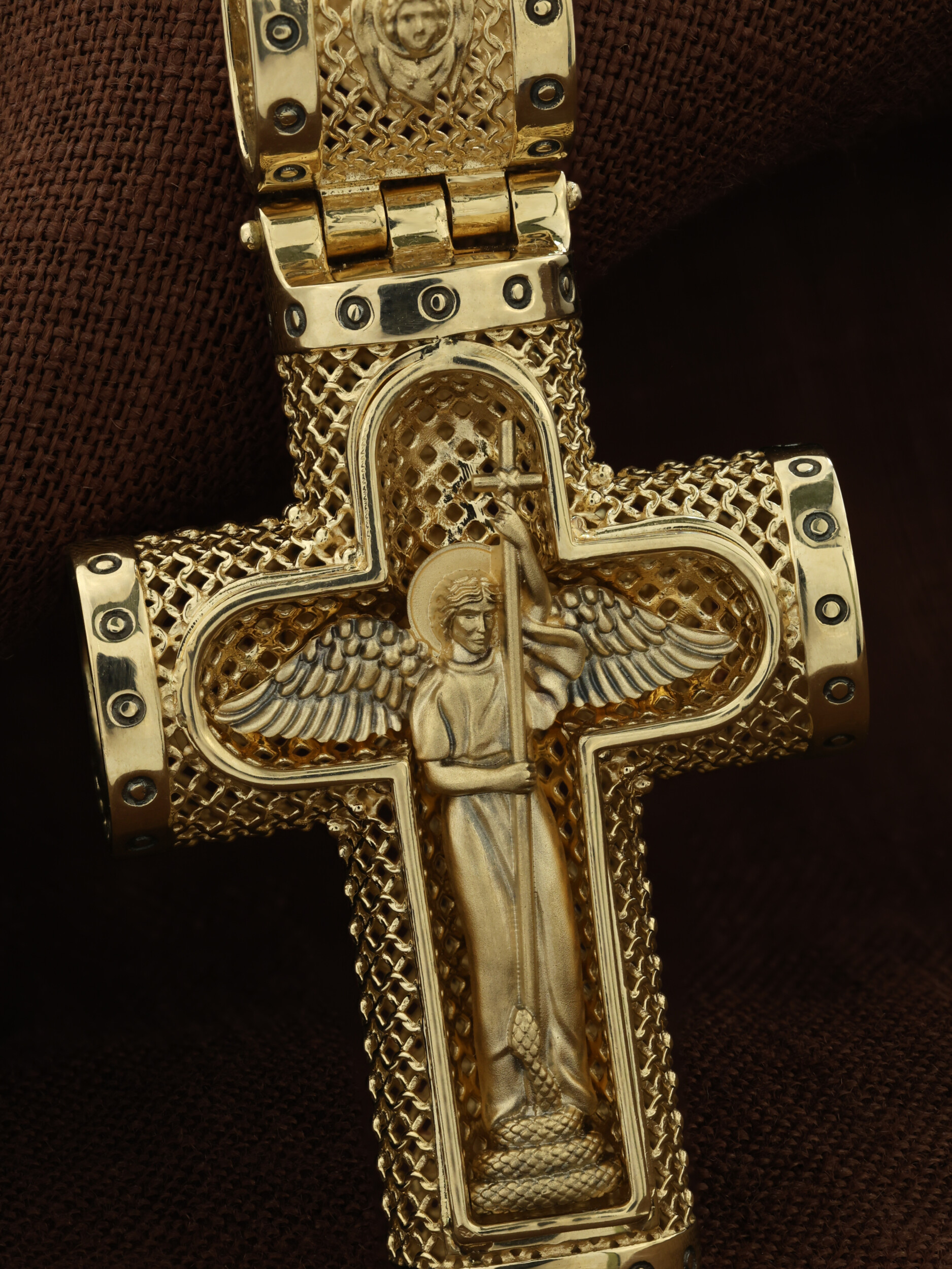 На лицевой стороне креста изображено Распятие Господа и Спасителя нашего Иисуса Христа. Крест- символ спасения и искупления рода человеческого, знамение победы над смертью и адом. Иисус Христос, как искупительная жертва освобождения человечества от власти греха, умер крестной смертью и в третий день воскрес. Распятие сопровождается каноническими надписями. На верхней табличке, выше головы Иисуса, расположена надпись, составленная Понтием Пилатом — «IНЦI». Она означает «Иисус Назорей, Царь Иудейский». Надписи «IC» «ХC», означает Иисус Христос, «НИКА», что означает Победитель, «Царь Славы» и «Сын Божий», размещается на разных сторонах поперечной перекладины креста. Крест стоит на горе камней, символизирующих Голгофу, которая обозначена надписью «Г Г». В ее основании различается череп — это голова Адама, обозначенный надписью «Г А». Надпись «МЛРБ» — «место лобное рай бысть» означает место лобное стало раем. Вдоль креста изображены орудия Страстей Христовых: копие сотника Лонгина, которым пронзили подреберье мёртвого Иисуса, чтобы убедиться в Его смерти, и трость с губкой, с которой Иисуса напоили уксусом. Они обозначены буквами «К» и «Т». На кулонном кольце размещен «Нерукотворный образ Иисуса Христа», на оборотной стороне кулонного кольца- шестикрылый Серафим.