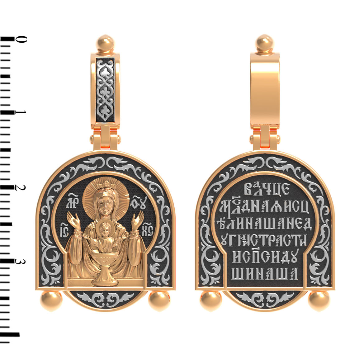 На лицевой части образка изображена икона Божией Матери «Неупиваемая чаша». Икона славится помощью в исцелении зависимостей, помогает людям обрести свободу от греховных страстей.