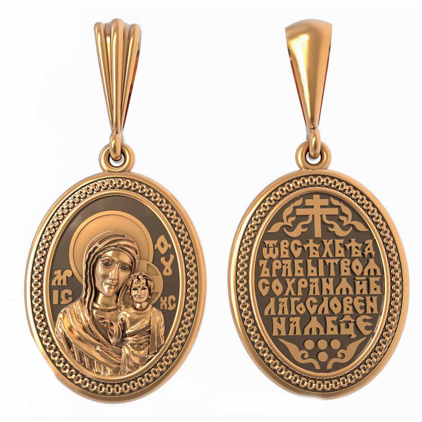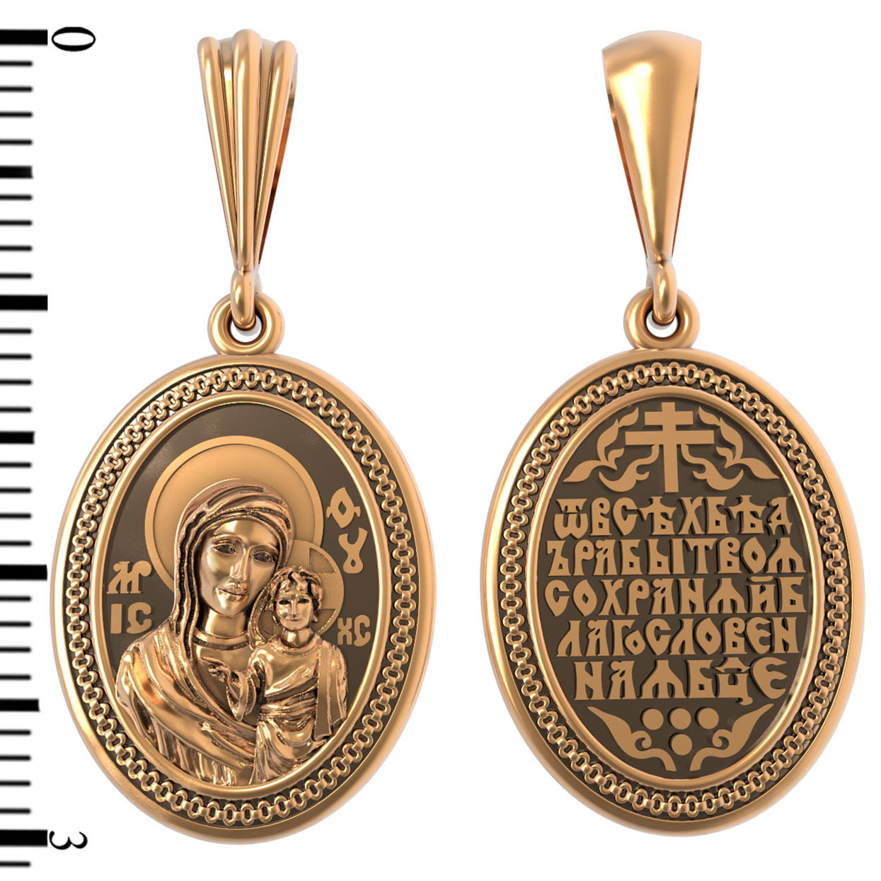 На лицевой части образка изображена Казанская икона Пресвятой Богородицы — одна из самых почитаемых в России. Икона была явлена на пожарище в Казани в 1579 году. В 1904 году святыня была похищена и уничтожена, но чудотворную силу иконы Богородица явила во многих ее списках. Молитва перед Казанской иконой Божьей Матери помогает во всех сложных случаях жизни, во всех печалях, невзгодах, скорбях.