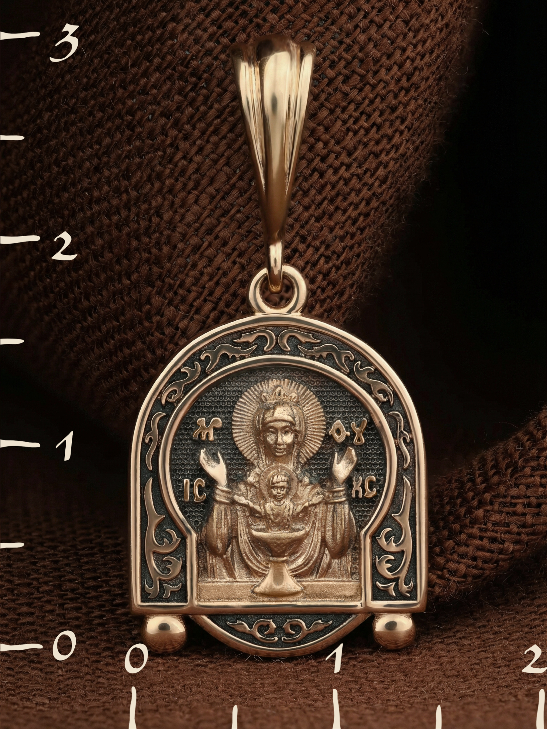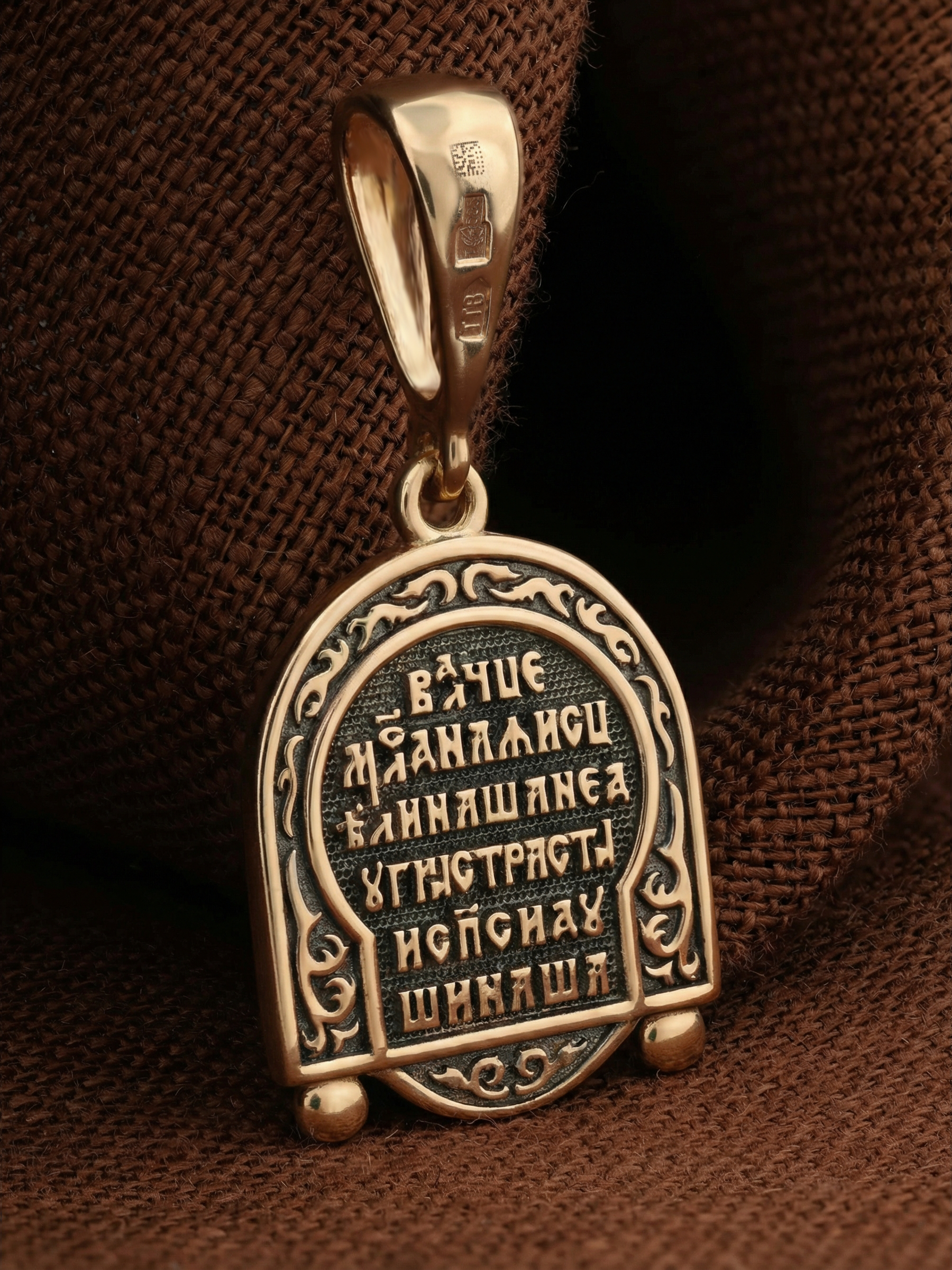 На лицевой части образка изображена икона Божией Матери «Неупиваемая чаша». Икона славится помощью в исцелении зависимостей, помогает людям обрести свободу от греховных страстей.