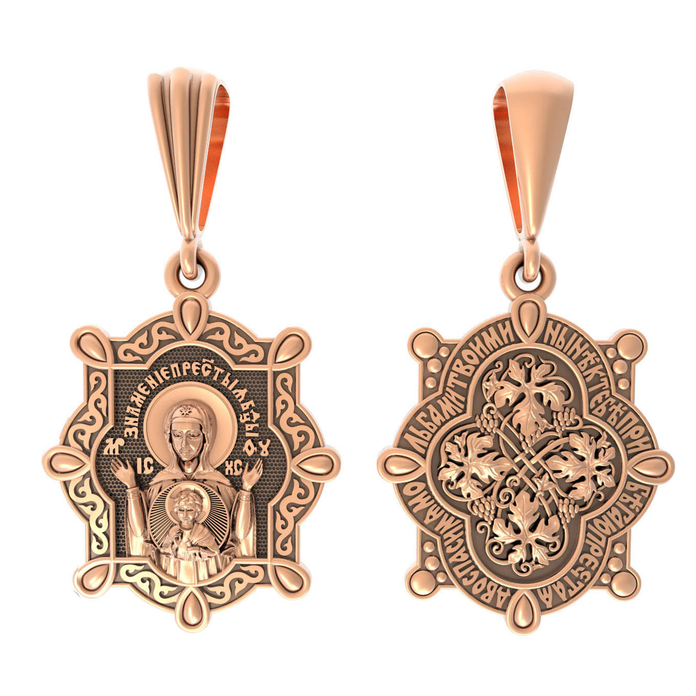 В центр образка помещен образ Божией Матери «Знамение», прославившийся многими чудесами в Новгороде в XII веке. Икона эта чтится как одна из самых великих святынь Русской земли. Молитвенно воздетые руки Богородицы означают заступничество за людей пред Богом. Рядом с Ней, на фоне круглого щита, — благословляющий Божественный Младенец — Спас-Эммануил.