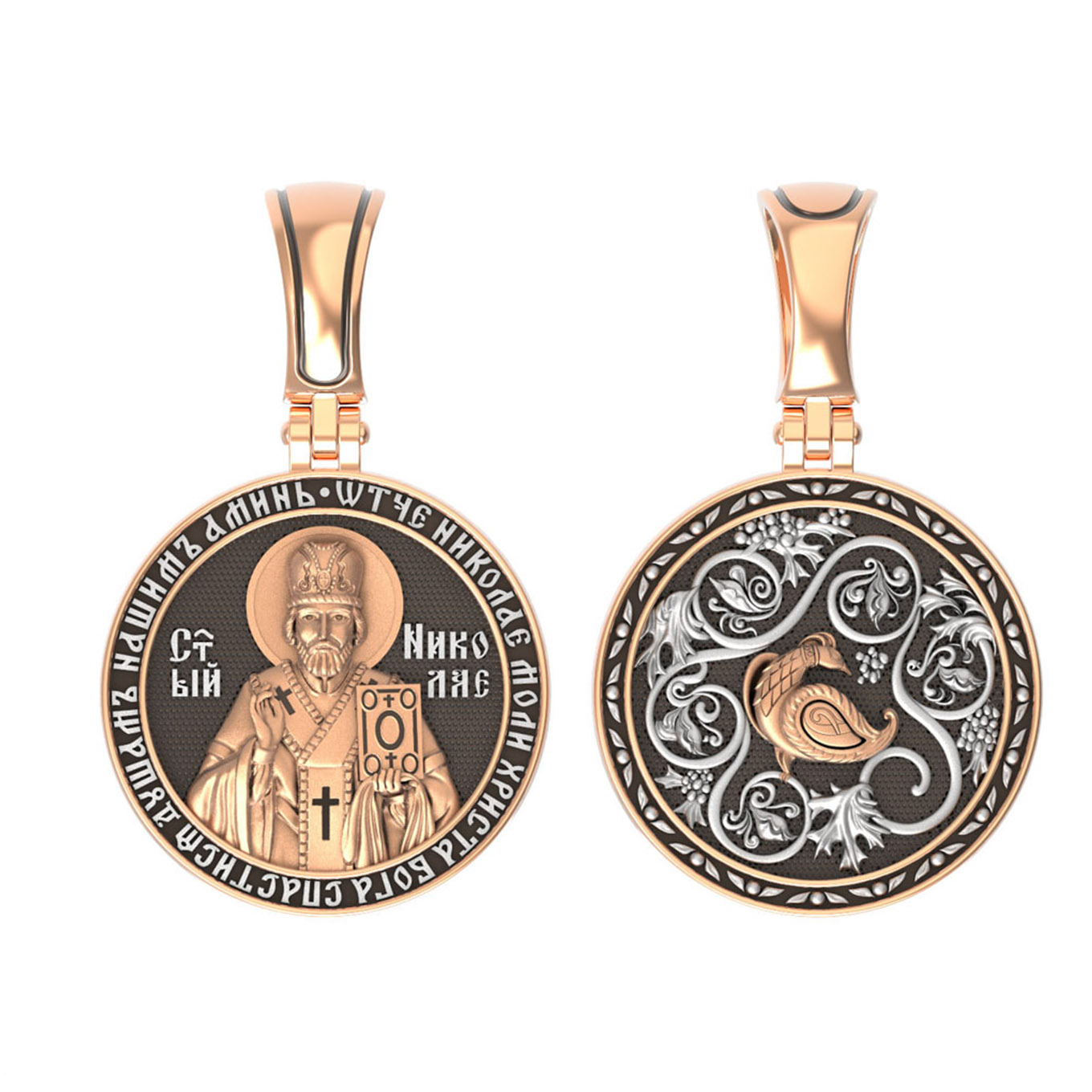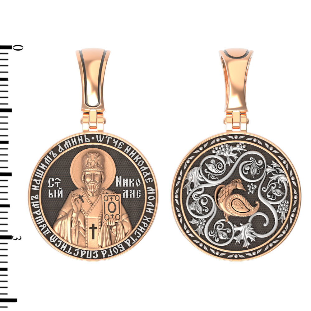 На лицевой стороне образка изображен Святитель Николай архиепископ Мир Ликийских, Чудотворец. Он является одним из самых почитаемых святых в православном мире. Избранник Божий Николай стал вершиной всех добродетелей. С кем из величайших праведников не сравнялся он образом духовной красоты, кому из них не последовал в своих деяниях и чудотворениях? Всеблаженный Николай был кроток, как Моисей, мужественен, как Давид, славен простотой нрава, как Иаков. Словно Ной, он спасал стадо Господне в новом ковчеге от потопа ересей. Вся жизнь святого Николая — это служение Богу. Много великих чудес сотворил на земле и на море великий Святитель Николай Угодник. Он укрощал штормы, спасал от потопления и выносил на сушу из глубины морской, освобождал из плена и приносил освобожденных домой, избавлял от уз и темницы, освобождал от смерти и подавал многим различные исцеления: слепым — прозрение, хромым — хождение, глухим — слух.