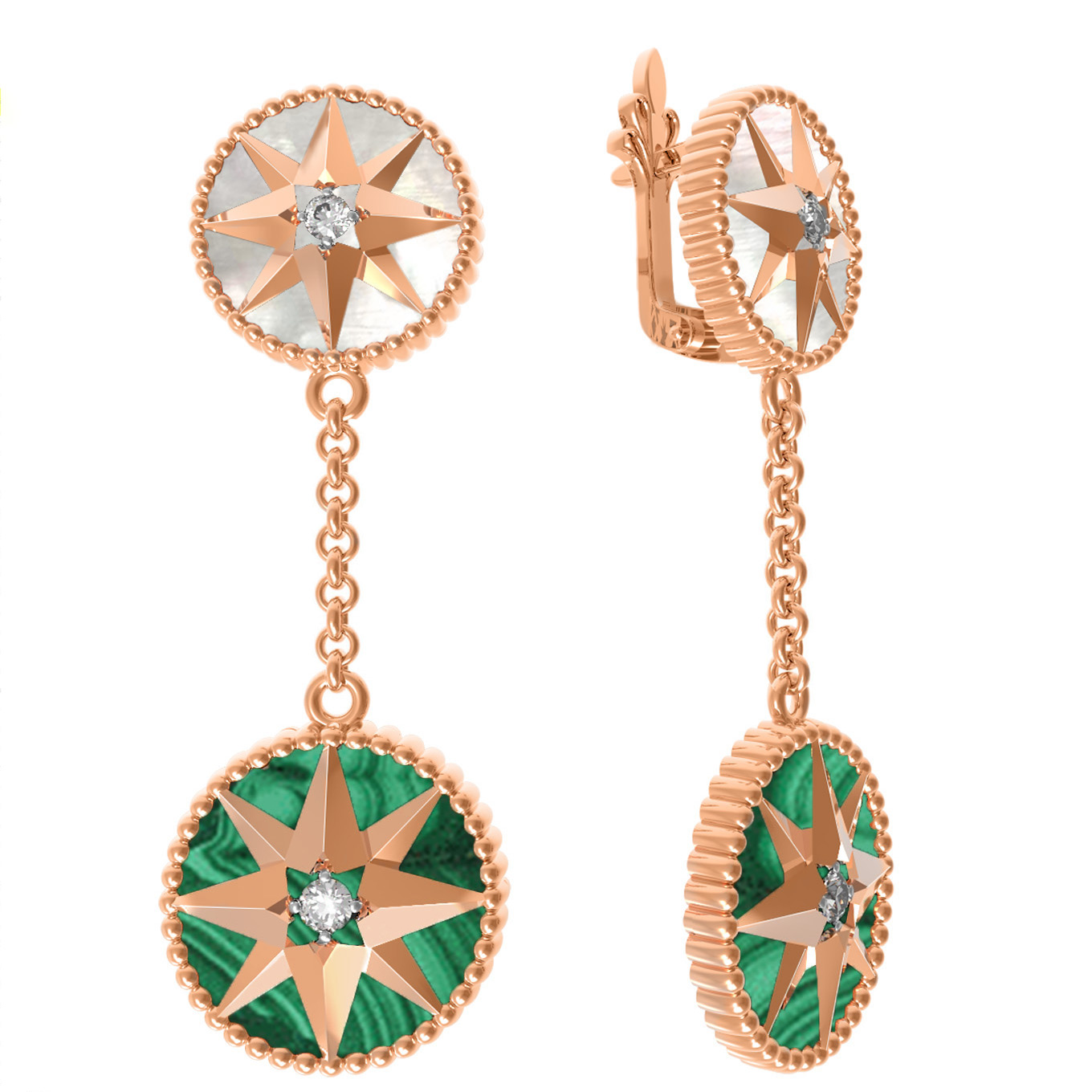 Серьги из золота c фианитом, малахитом и перламутром