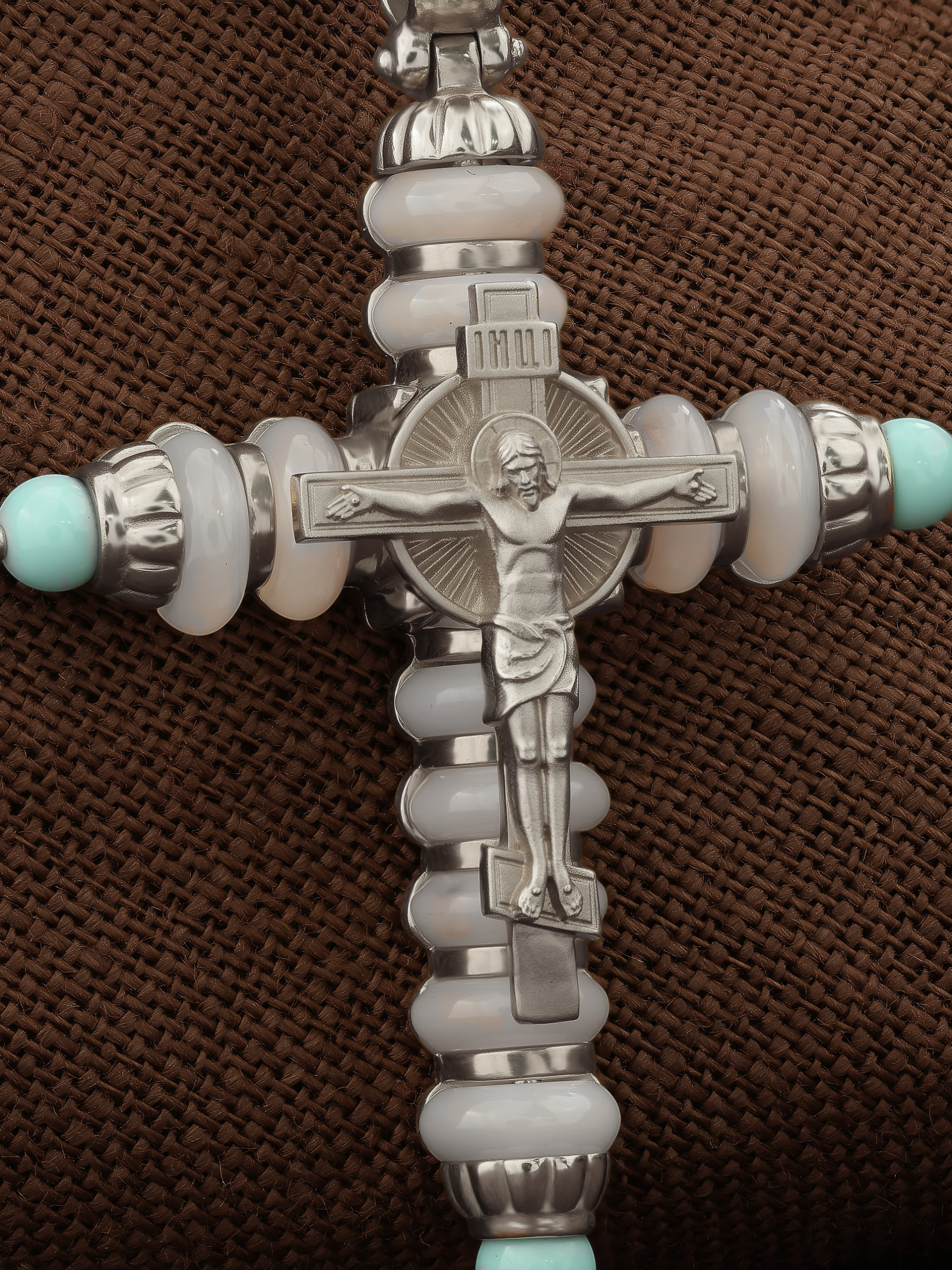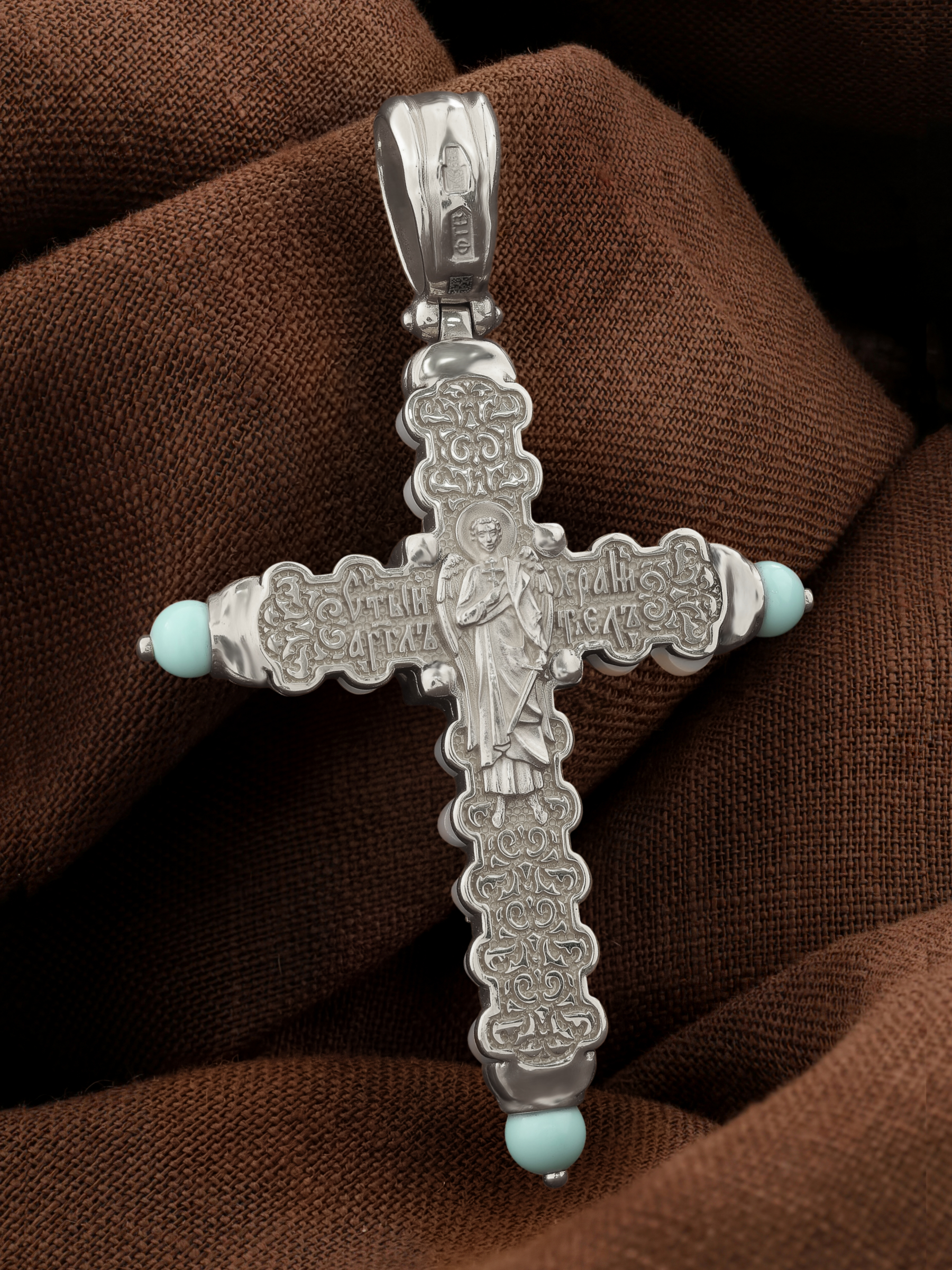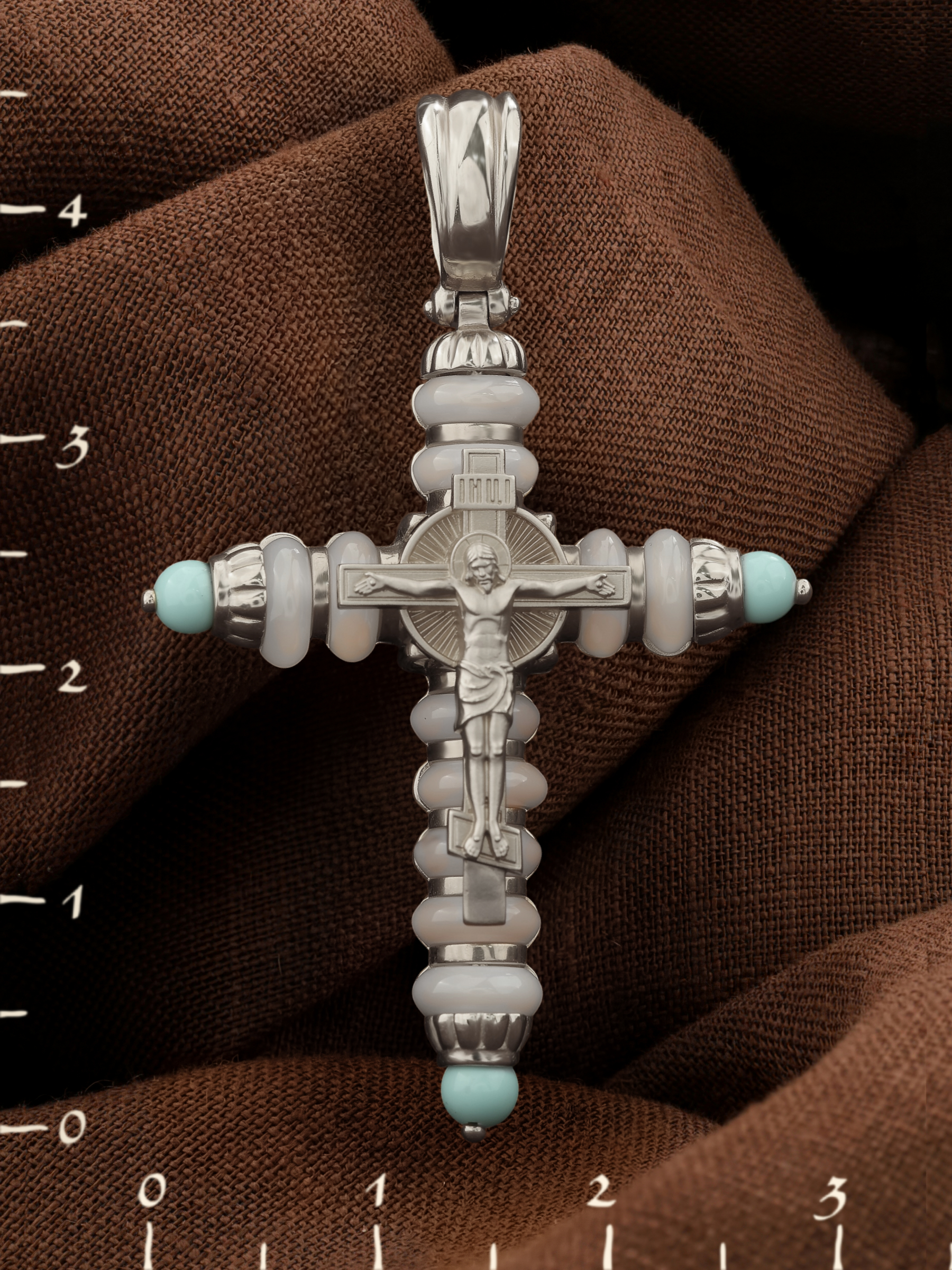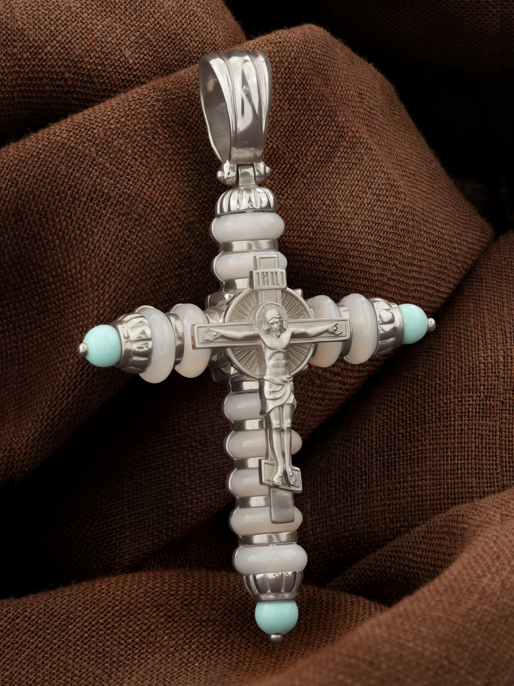 Крест из белого золота c бирюзой и кахолонгом