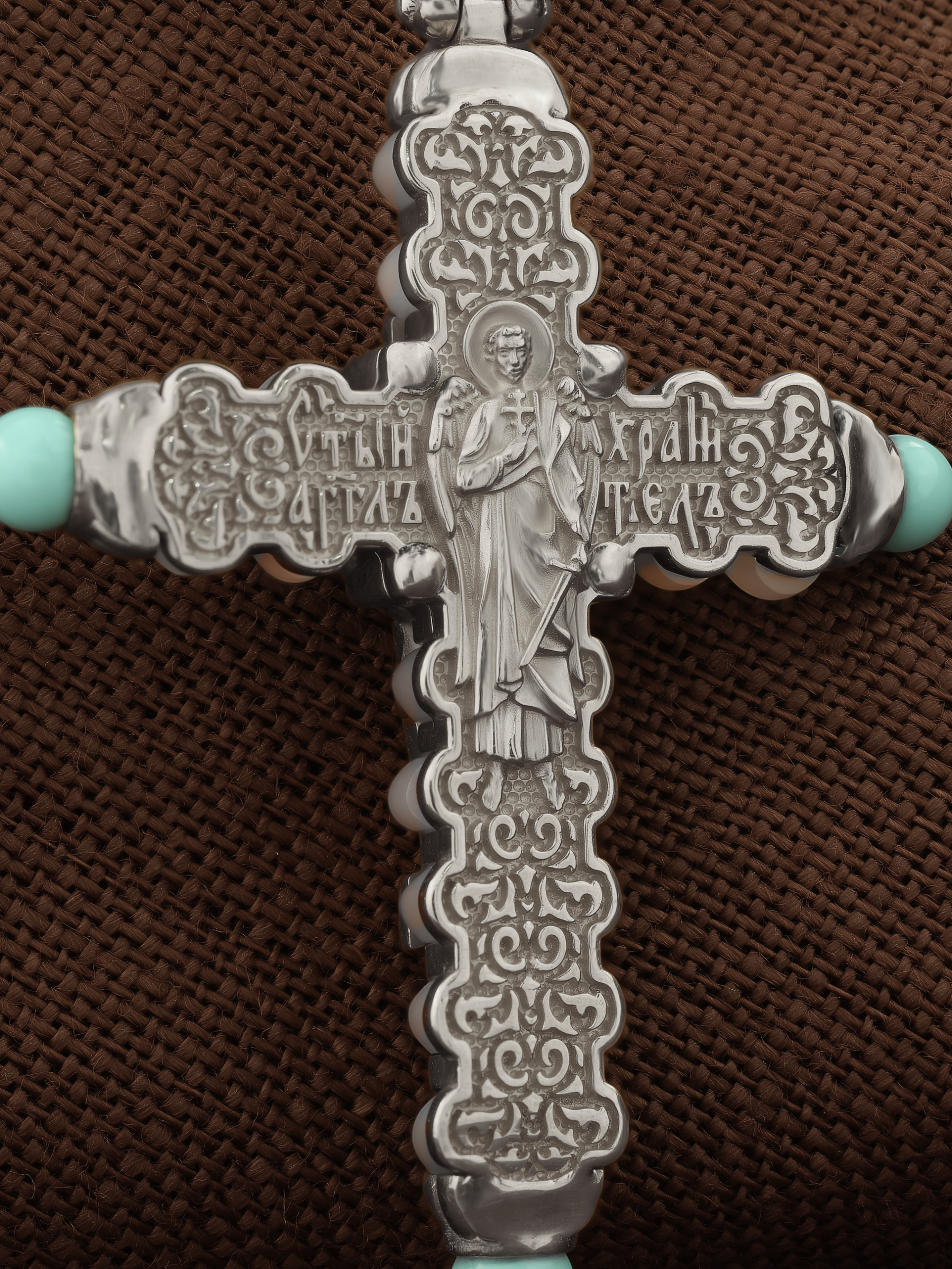 На оборотной стороне креста изображен святой Ангел-Хранитель в виде прекрасного юноши держащего в правой руке крест, а в левой — сферу. Ангел-Хранитель — это Ангел приставляемый Богом к человеку при крещении для охраны и помощи в добрых делах. Невидимо пребывая при нас постоянно, он, руководствуя нас ко спасению, не только по нашему желанию таинственно наставляет нас на все доброе и полезное, не только возносит наши молитвы к Богу, но еще и сам от себя охраняют и защищают нас от врагов видимых и невидимых, ходатайствует за нас пред Богом.
