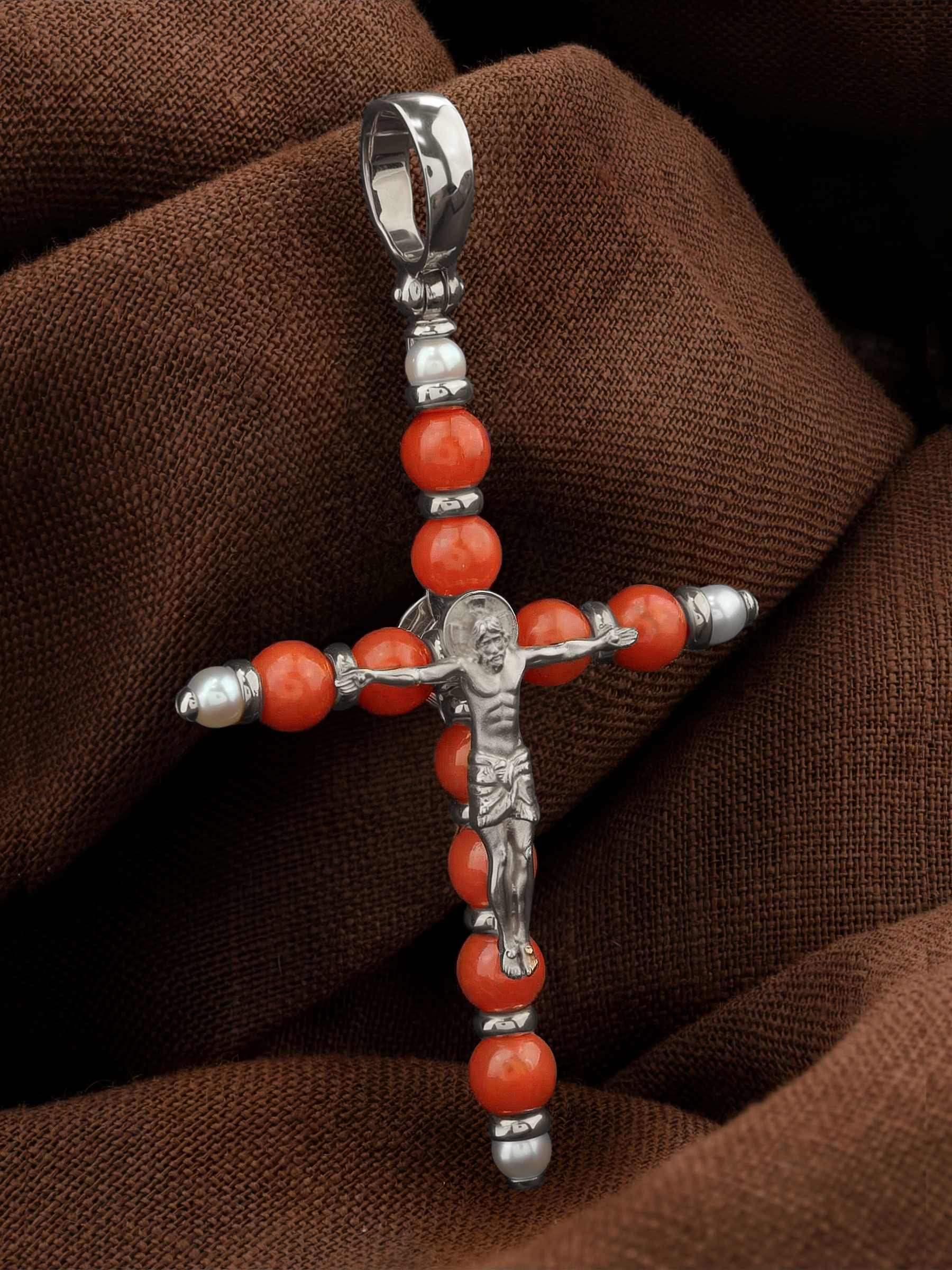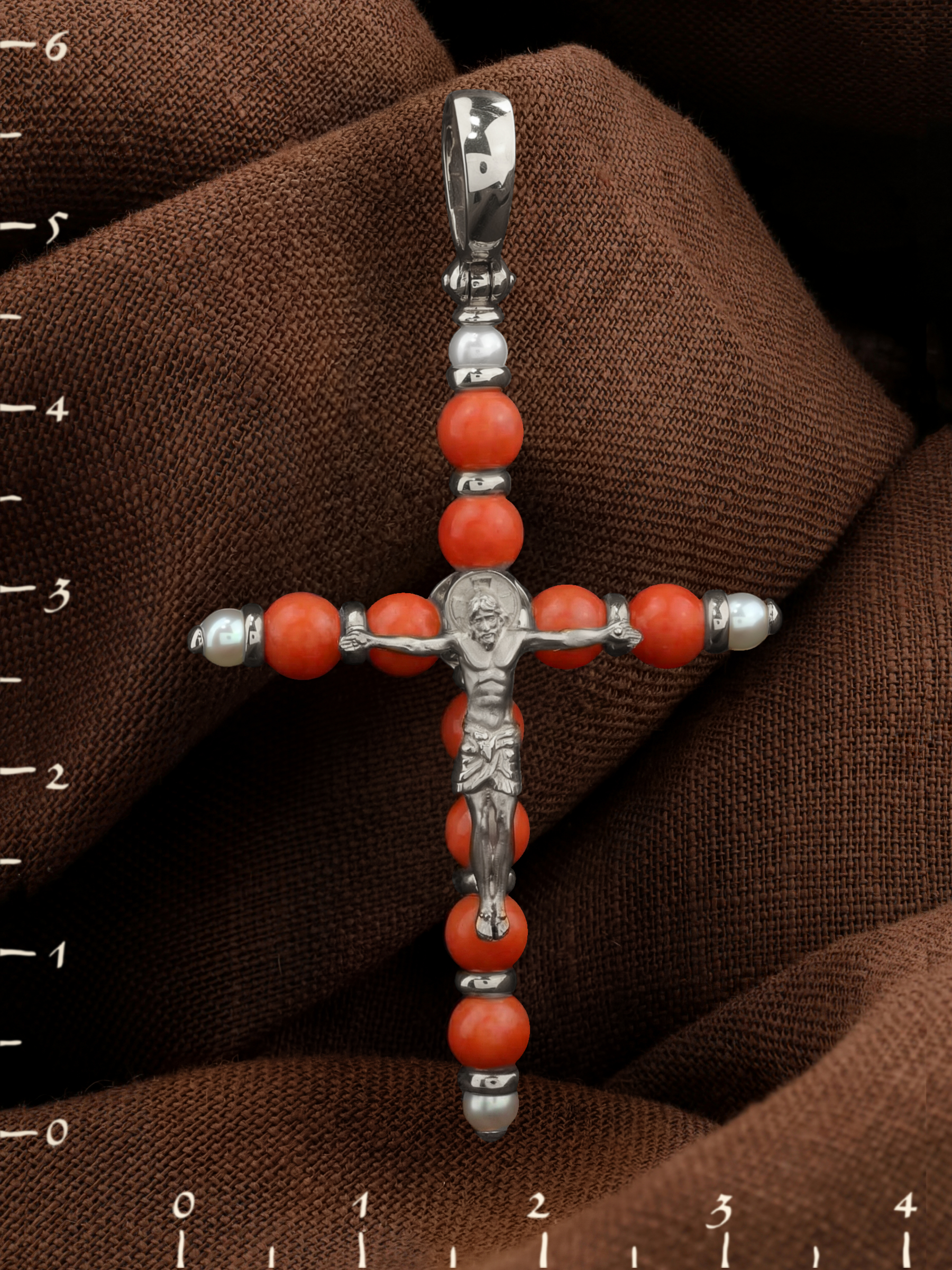 Крест из белого золота c жемчугом и кораллом
