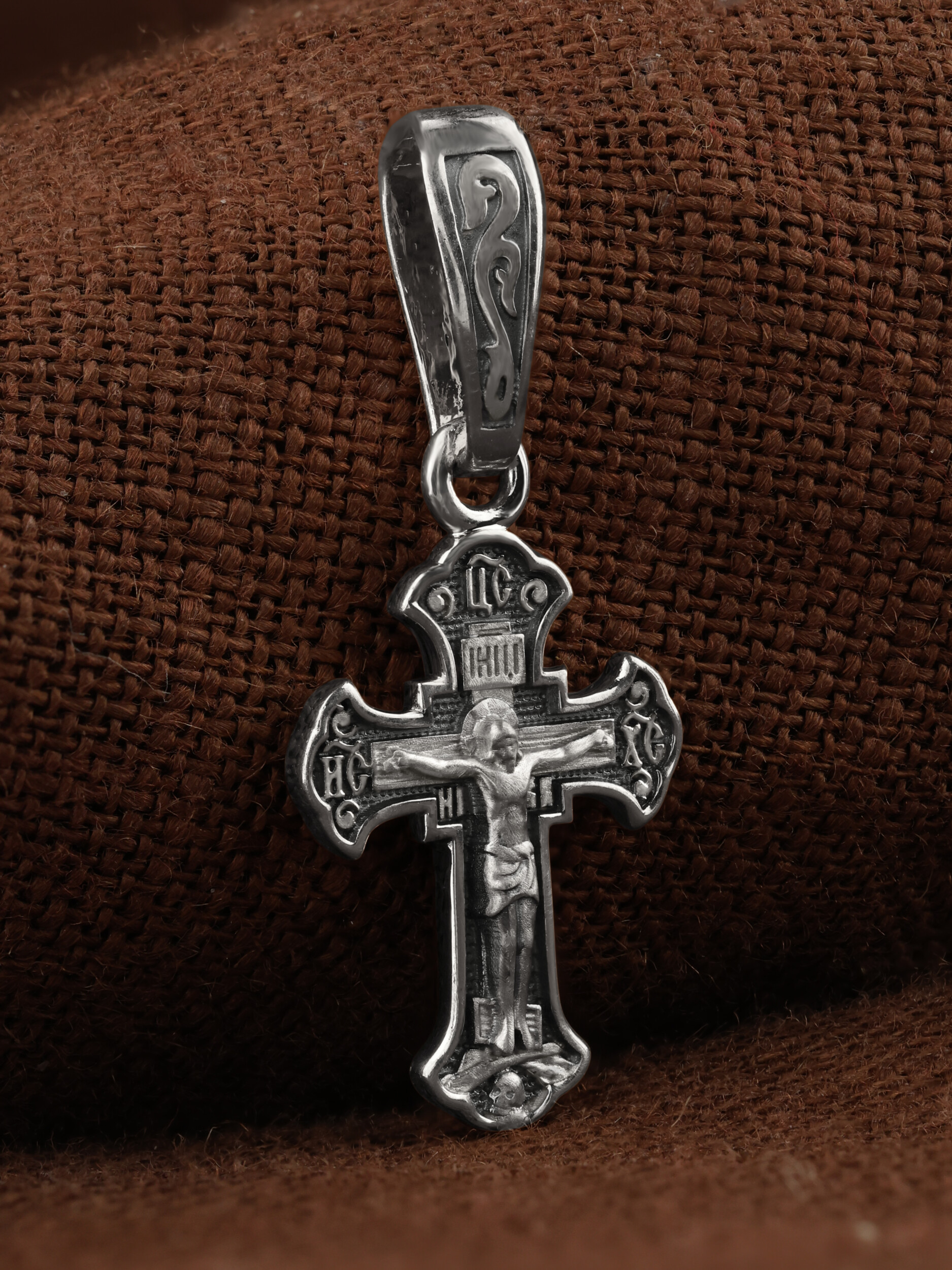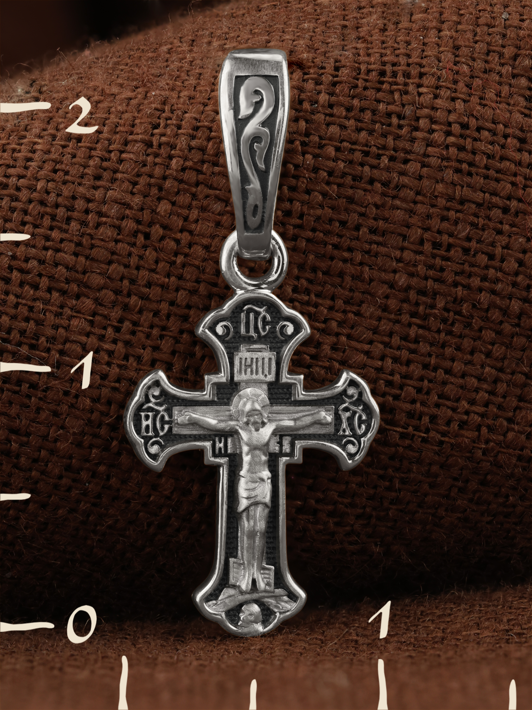 На лицевой стороне креста изображено Распятие Господа и Спасителя нашего Иисуса Христа, отдавшего Себя на смерть для искупления грехов мира. Крест является символом жертвенной любви Всеблагого Бога к падшим людям, всепобеждающим духовным оружием христиан, основанием и средоточием церковной жизни. Над вершиной Распятия помещена надпись «Царь Славы». На верхней перекладине расположена надпись «IНЦI». Она символизирует титло — табличку, на которой, согласно Евангелию, было начертано: Иисус Назорей, Царь Иудейский. Надпись «IC» «ХC»», означает Иисус Христос, помещаются на разных сторонах поперечной перекладины креста. Ниже помещена надпись «НИКА», что означает «победитель». Крест стоит на горе камней, символизирующих Голгофу. Под подножием Креста изображена покоящаяся голова (череп) Адама.