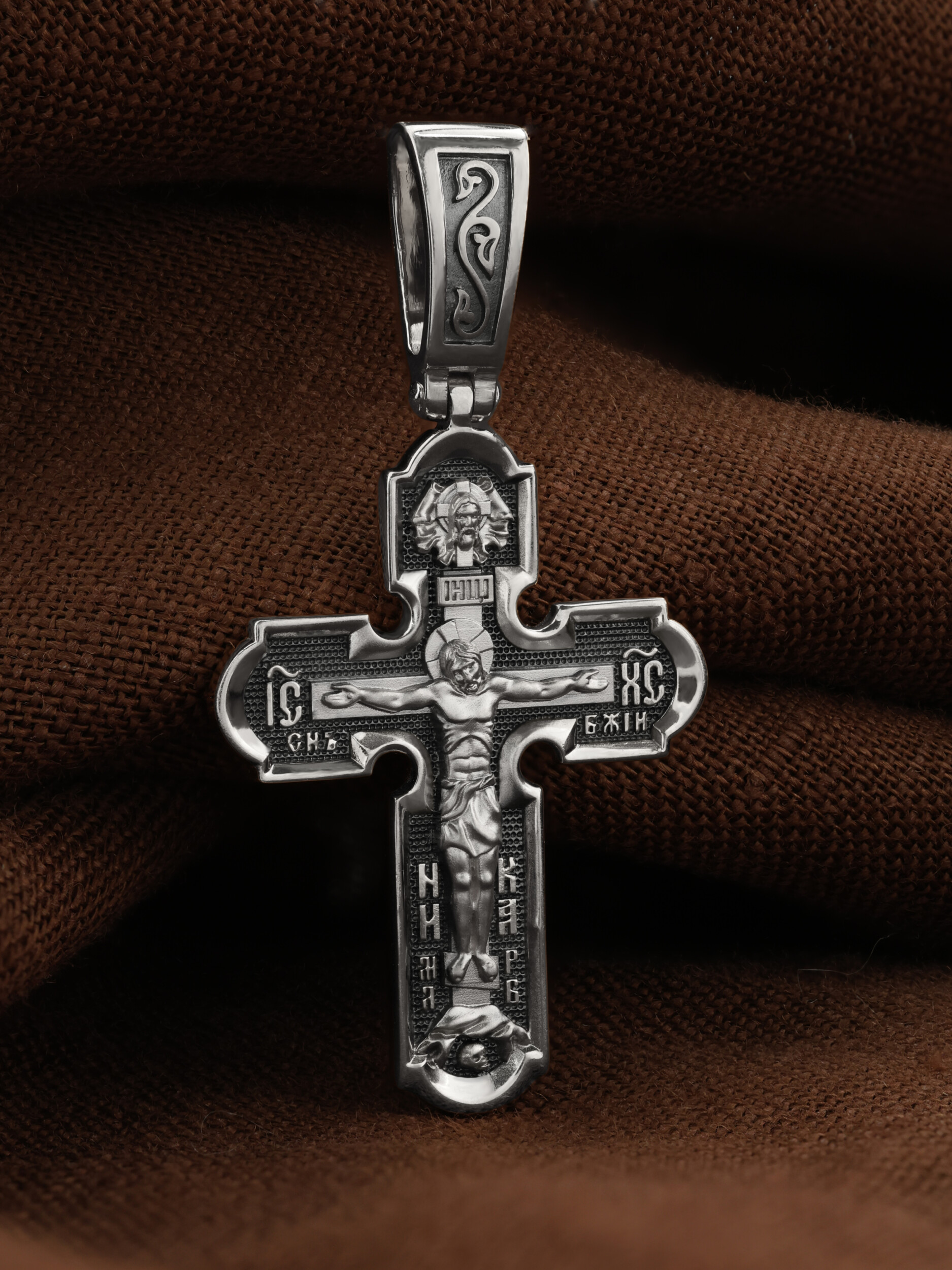 На лицевой стороне нательного креста по традиции изображено Распятие Господа нашего Иисуса Христа. Крест Господень стоит на небольшом каменистом возвышении, символизирующем гору Голгофу, которая обозначена буквами МЛРБ (Место Лобное Рай Бысть). Над головой Господа на поперечной перекладине написано «ИНЦИ», что символизирует табличку, которая была прибита к Кресту, с надписью «Иисус Назорей Царь Иудейский». Этим иудеи хотели посмеяться над Христом, не зная, что распинают истинного Царя всех царей. По сторонам основной перекладины расположены позолоченные рельефные инициалы Христа «ИС ХС». Под перекладиной, по сторонам древа, находится надпись «СЫН БОЖИЙ», а в основании креста — надпись «НИКА» (Победитель).