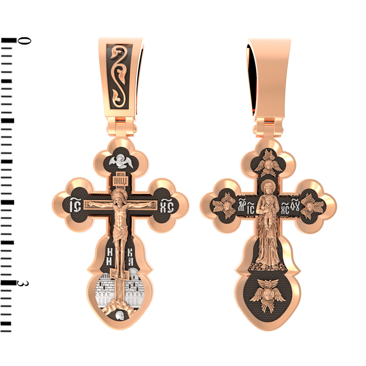Распятие сопровождается иконографическими надписями, прославляющими Господа Иисуса Христа. На боковых оконечностях размещены инициалы святого имени Спасителя «IС ХС» и надпись «Сын Божий», обозначающая Его божественную природу. На подножии Креста можно прочитать надпись «НИКА» (Победитель) — символ победы Господа над смертью. Венчает лицевую сторону образ Святого Духа в виде голубя.