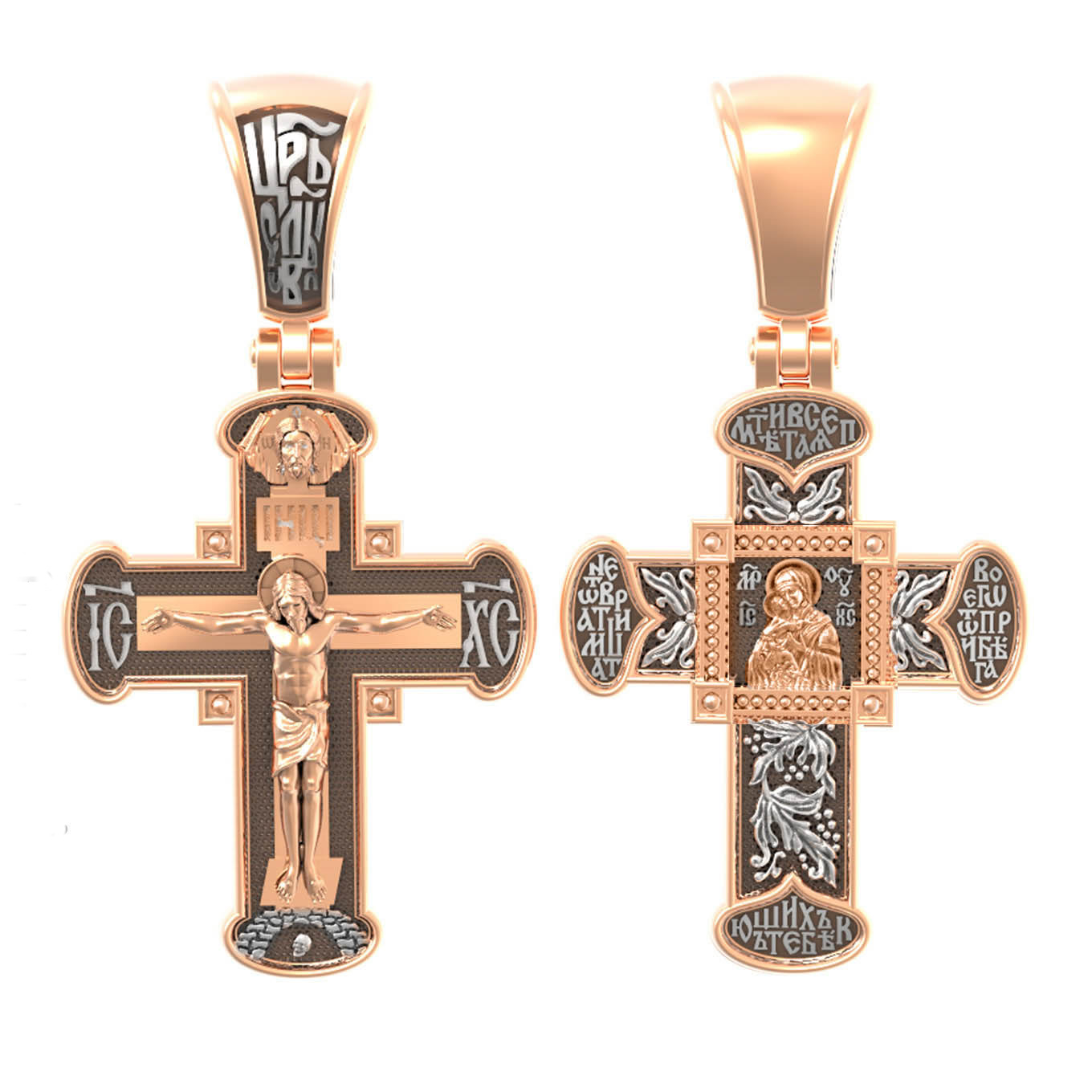 На лицевой стороне креста изображено Распятие Господа и Спасителя нашего Иисуса Христа, отдавшего Себя на смерть, для искупления грехов мира. Крест является символом жертвенной любви Всеблагого Бога к падшим людям, всепобеждающим духовным оружием христиан, основанием и средоточием церковной жизни. Господь сказал: «кто хочет идти за Мною, отвергнись себя, и возьми крест свой, и следуй за Мною». (Мк. 8: 34). На кулонном кольце помещена надпись «Царь Славы». На верхней табличке, выше головы Иисуса, расположена надпись, составленная Понтием Пилатом — «IНЦI». Она означает «Иисус Назорей, Царь Иудейский». Над ней — Нерукотворный образ Господа и Спасителя нашего Иисуса Христа, чудесно отпечатавшийся на плате, котором Христос вытер свой лик. Надпись «IC» «ХC», означает Иисус Христос, помещается на разных сторонах поперечной перекладины креста. Крест стоит на горе камней, символизирующих Голгофу. В ее основании различается череп– это голова Адама.