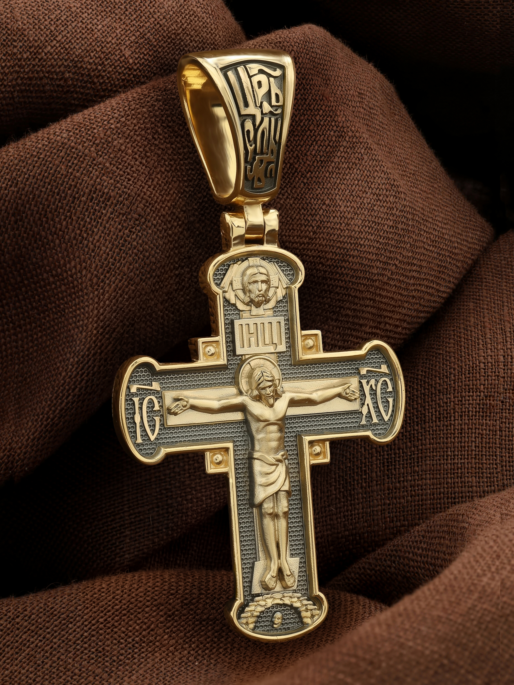 На лицевой стороне креста изображено Распятие Господа и Спасителя нашего Иисуса Христа, отдавшего Себя на смерть, для искупления грехов мира. Крест является символом жертвенной любви Всеблагого Бога к падшим людям, всепобеждающим духовным оружием христиан, основанием и средоточием церковной жизни. Господь сказал: «кто хочет идти за Мною, отвергнись себя, и возьми крест свой, и следуй за Мною». (Мк. 8: 34). На кулонном кольце помещена надпись «Царь Славы». На верхней табличке, выше головы Иисуса, расположена надпись, составленная Понтием Пилатом — «IНЦI». Она означает «Иисус Назорей, Царь Иудейский». Над ней — Нерукотворный образ Господа и Спасителя нашего Иисуса Христа, чудесно отпечатавшийся на плате, котором Христос вытер свой лик. Надпись «IC» «ХC», означает Иисус Христос, помещается на разных сторонах поперечной перекладины креста. Крест стоит на горе камней, символизирующих Голгофу. В ее основании различается череп– это голова Адама.
