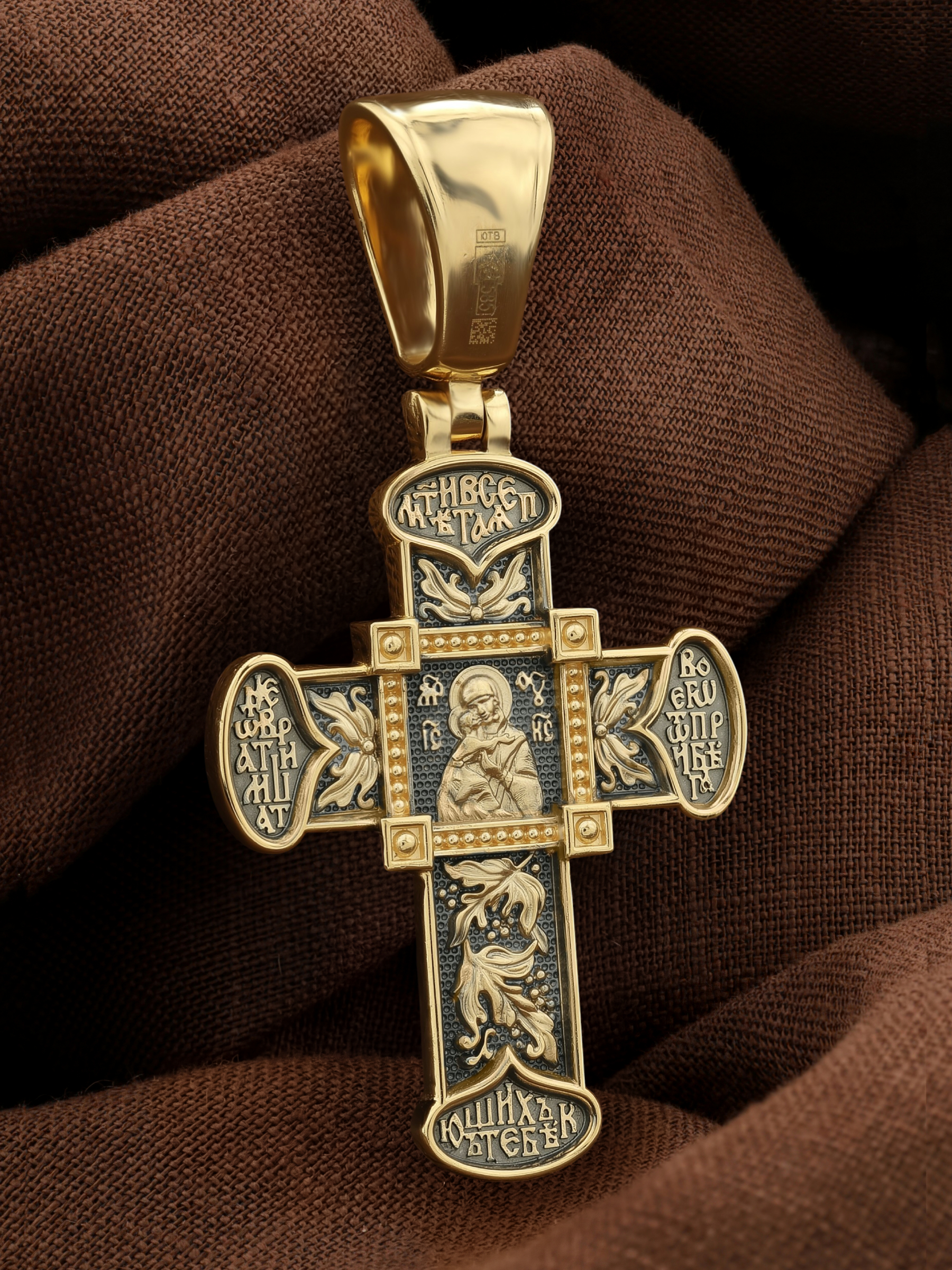 В центре оборотной стороне креста помещен образ Владимирской иконы Божией Матери — один из самых чтимых святынь Русской православной церкви. По преданию, икона была написана Святым апостолом и евангелистом Лукой во время земной жизни Богородицы. Дева Мария, увидев Свое изображение, молвила: «Отныне ублажат Мя вси роди. Благодать Рождшегося от Меня и Моя с сим образом да будет». Образ написан в лирическом иконографическом типе «Умиление». Младенец припал щекой к щеке Матери и тянется к ней правой рукой, другой нежно обнимая за шею. Икона Владимирской Божией Матери вплоть до V века находилась в Иерусалиме, затем была перевезена в Византию. На Русь икона была привезена в 1131 г. За прошедшие столетия святыня неоднократно переезжала из Владимира в Москву и обратно, не раз спасая страну от захватчиков. Русская Православная Церковь установила троекратное празднование Владимирской иконе Божией Матери. Каждый из дней празднования связан с избавлением русского народа от порабощения иноплеменниками по молитвам ко Пресвятой Богородице. В последующие века у иконы происходили многие важные исторические события: подписание актов, принятие присяги значимых государственных деятелей и возведение на престол. Вокруг образа, по сторонам Креста, написана молитва: «Мати Всепетая, не отврати лица Твоего от прибегающих к Тебе». Оборотная сторона креста украшена растительным орнаментом.