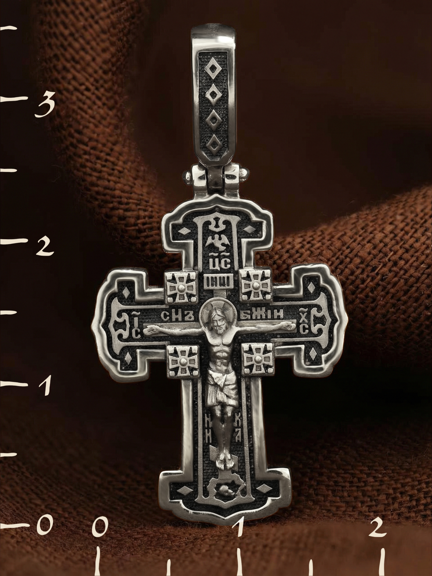На лицевой стороне креста изображено Распятие Господа и Спасителя нашего Иисуса Христа. В Голгофе сокрыта непостижимая тайна бесконечной правды и любви Бога. Крест стал символом победы добра над злом, жизни над смертью, напоминанием бесконечной Божьей любви, предметом радости. Воплотившийся Сын Божий Своею кровью освятил крест и сделал его проводником Своей благодати, источником освящения верующих. Над вершиной Распятия помещена надпись «Царь Славы» и изображение Духа Святого в виде голубя, сходящего с небес. Надпись «IС» « ХС» означает Иисус Христос и помещается на разных сторонах поперечной перекладины креста. Рядом расположена надпись «Сын Божий». Слово «НИКА», что означает «победитель», помещаются в нижней части креста. Крест стоит на горе камней, символизирующих Голгофу. В ее основании различается череп — это голова Адама. На православном кресте Христос не умирает, а свободно простирает руки, ладони Иисуса открыты, будто он хочет обнять все человечество, даря им свою любовь и открывая путь к вечной жизни.