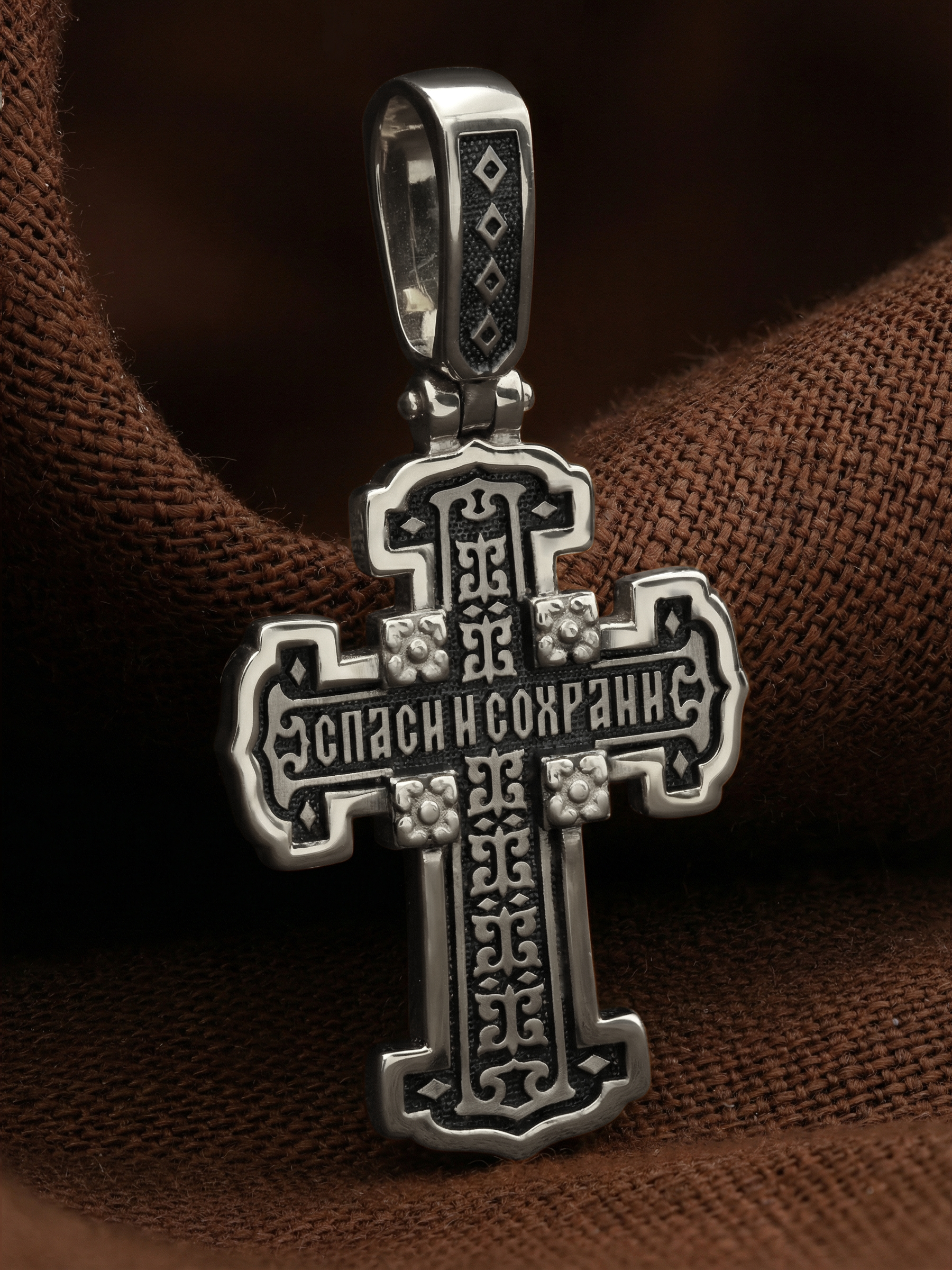 На оборотной стороне креста написана молитва: «Спаси и сохрани». Крест украшен орнаментом.