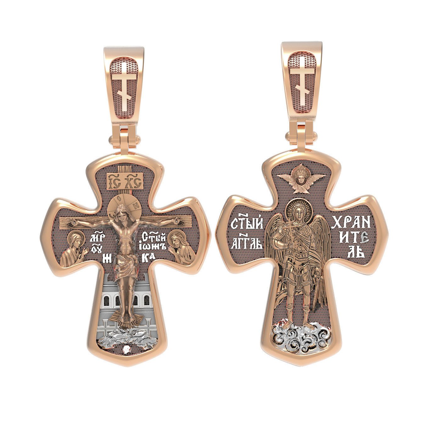 На лицевой стороне креста изображено Распятие Господа и Спасителя нашего Иисуса Христа, отдавшего Себя на смерть, для искупления грехов мира. Господь сказал: кто хочет идти за Мною, отвергнись себя, и возьми крест свой, и следуй за Мною. (Мк. 8: 34). Крест является символом жертвенной любви всеблагого Бога к падшим людям, всепобеждающим духовным оружием христиан, основанием и средоточием церковной жизни. На верхней перекладине помещена надпись «IС» « ХС», что означает Иисус Христос. Ниже — слово «НИКА», что означает «победитель». Слева от Распятия изображена Пресвятая Богородица, справа — апостол и евангелист Иоанн Богослов, один из ближайших учеников Иисуса Христа. За Распятием высится Иерусалимская стена, в знак того, что Господь был распят вне стен города. Возвышение, на котором стоит Крест, символизирует гору Голгофу, на которой произошло Распятие. Под подножием Креста изображена покоящаяся голова (череп) Адама. На кулонном кольце помещен крест.