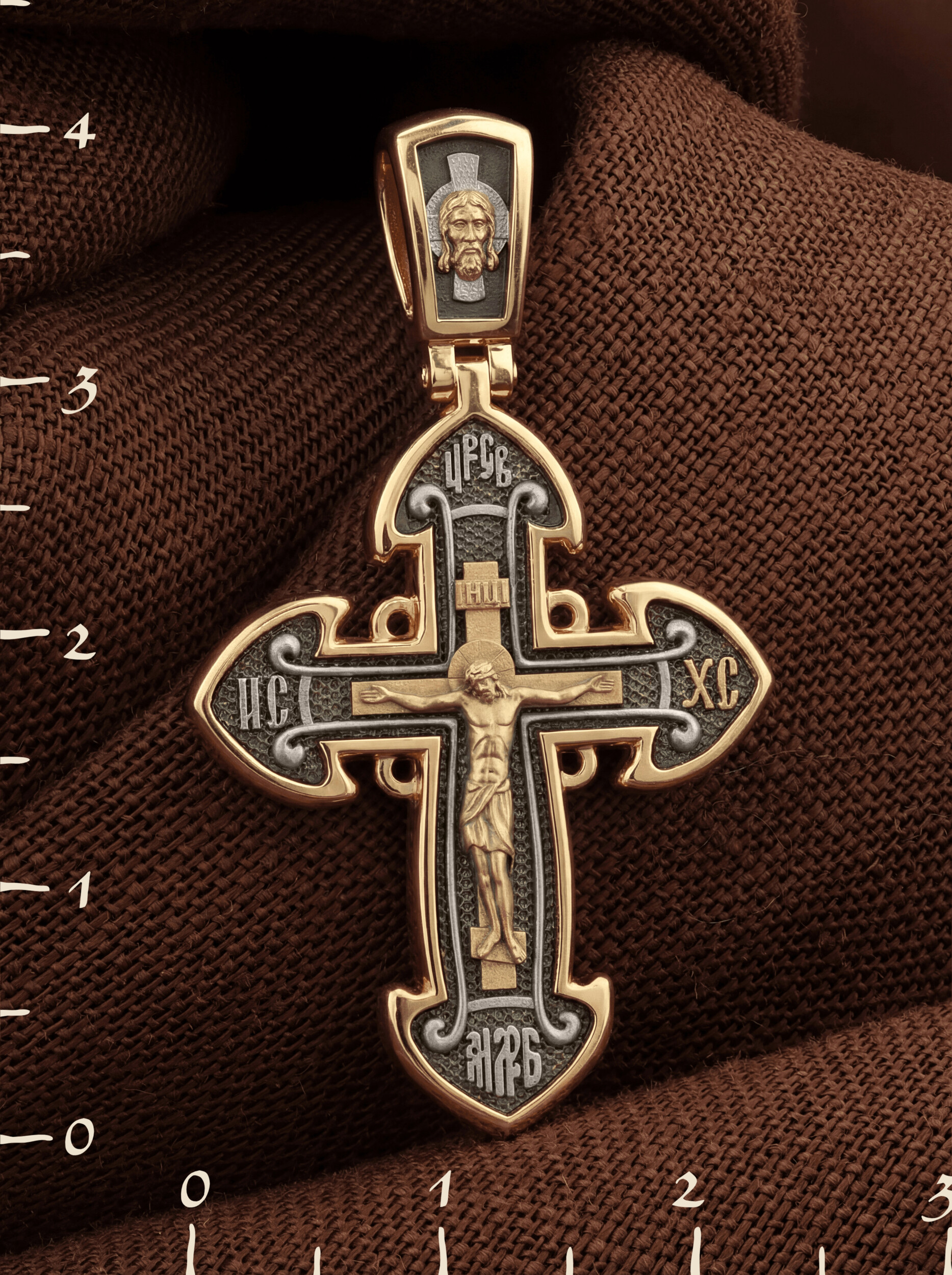 Традиционно на лицевой стороне этого креста изображено Распятие. Это связано с тем, что любой нательный крест в первую очередь символизирует крестные страдания Христа, Его смерть и Воскресение. Поэтому древний вид Распятия являет вознесенного на Крест Сына Божия не просто прибитого к кресту, а словно простирающего руки и призывающего в Свои объятия весь мир. Сохраняя образ страдания Христа, такой вид Распятия в то же время удивительно точно передает его духовный смысл. Христос, распятый и умерший, изображен живым в самой Своей смерти. С двух сторон раскинутых рук Христа написаны инициалы Его имени — «ИС ХС». Сверху над Распятием размещена надпись «Царь Славы», а у подножия Господа видна аббревиатура «МЛ РБ» (Место Лобное Рай Бысть), символизирующая гору Голгофу.