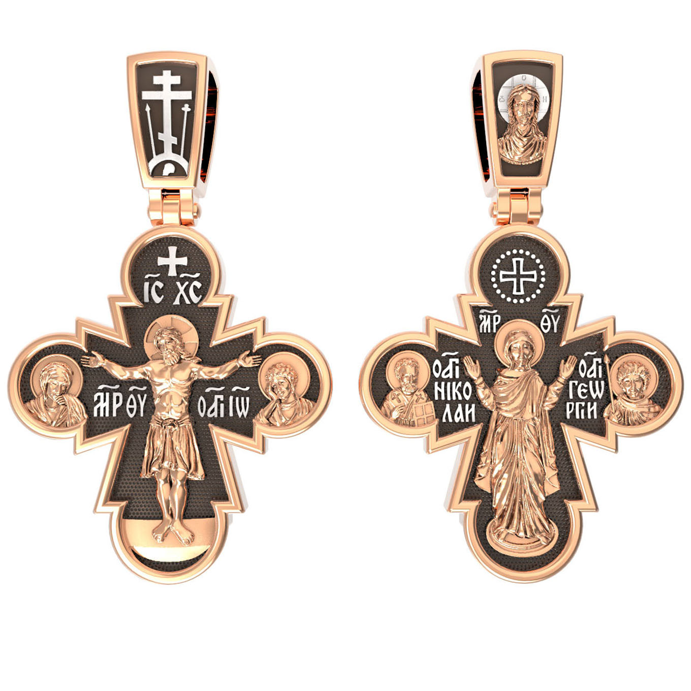 На лицевой стороне этого креста Иисус Христос является как Господь, Творец мира и его Грозный Судия, царящий на Небесах. Православная иконография показывает нам распятого Господа не в виде мучительно умирающего человека, а как величественного и всесильного Бога, который простирает руки, словно обнимает весь мир. Человеческие страдания Господа обычно только обозначаются наклоном Его головы и полузакрытыми глазами. С двух сторон Христу предстоят Пресвятая Богородица и Святой апостол и Евангелист Иоанн Богослов.