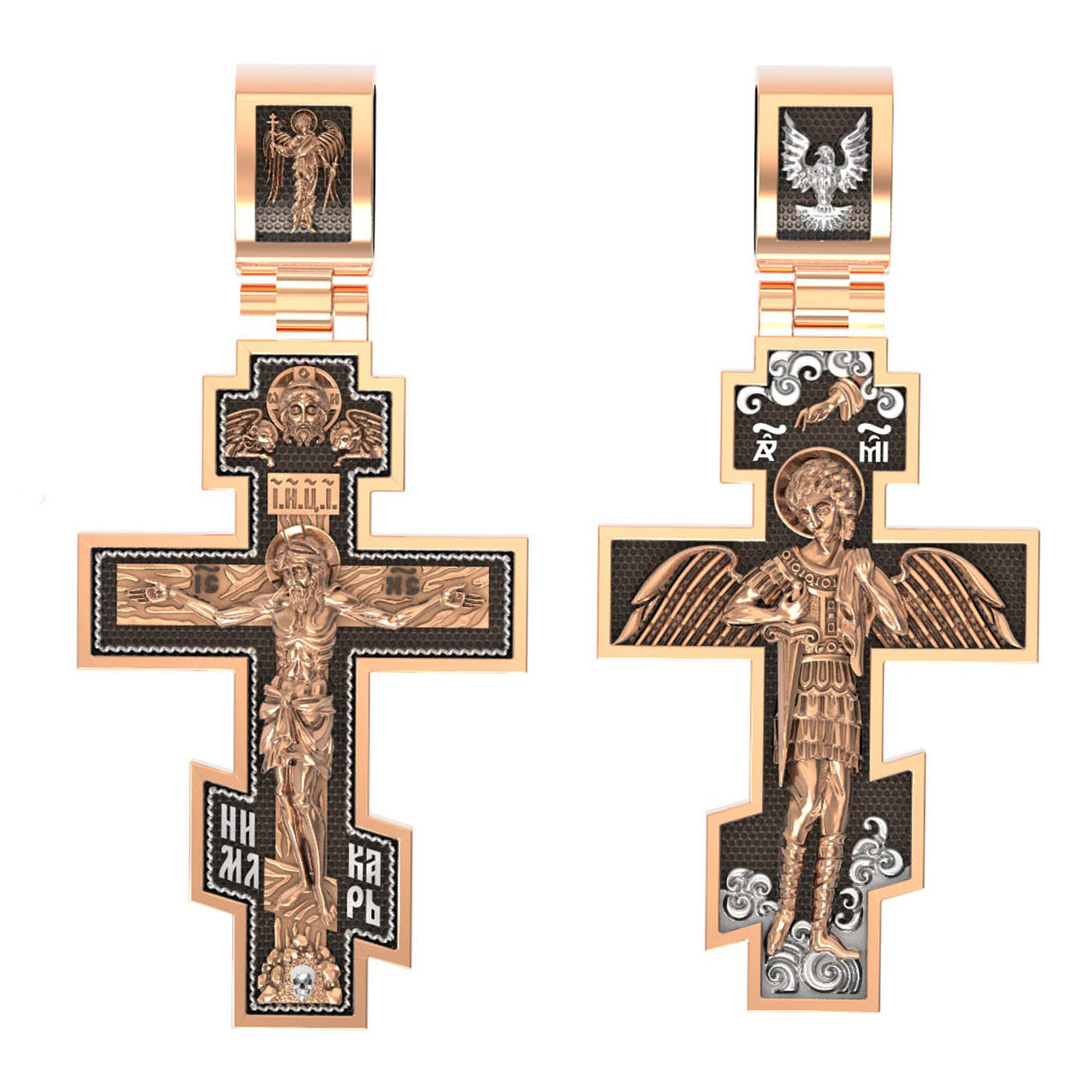 На оборотной стороне креста помещен Архангел Михаил, самый могущественный из ангелов. Это он низверг дьявола и встал во главе ангелов для борьбы с бесовскими силами. Его имя означает «Кто яко Бог?», так как он самый могучий и грозный враг зла. Древнерусские князья и воины стремились обрести покровительство Небесного Воеводы и нередко украшали свои шлемы его крылатой фигурой. На Руси также верили, что Архангел Михаил, как непримиримый враг дьявола, защищает и души умерших от бесовских нападений, провожая их на Небеса. Поэтому ему часто посвящались кладбищенские церкви.