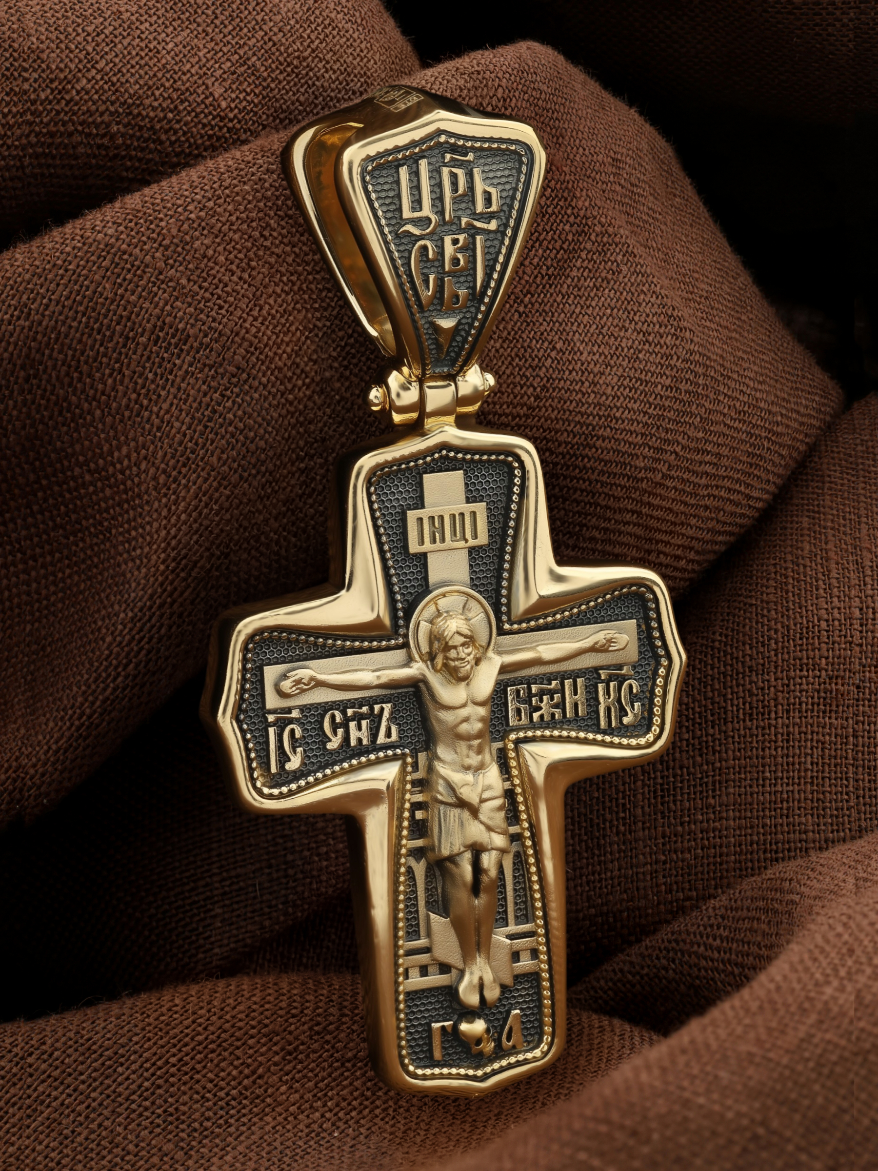 На лицевой стороне креста изображено Распятие Господа и Спасителя нашего Иисуса Христа. Крест- символ спасения и искупления рода человеческого, знамение победы над смертью и адом. Он стал символом восстания из мертвых и обретения вечной жизни в Царствии Иисуса Христа, величайшим символом силы и власти Христовой. Иисус Христос, как искупительная жертва освобождения человечества от власти греха, умер крестной смертью и в третий день воскрес. На верхней табличке, выше головы Иисуса, расположена надпись, составленная Понтием Пилатом — «IНЦI». Она означает «Иисус Назорей, Царь Иудейский». На кулонном кольце помещена надпись «Царь Славы». Надпись «IС» « ХС» означает Иисус Христос и помещается на разных сторонах поперечной перекладины креста. Рядом расположена надпись «Сын Божий». За крестом высится Иерусалимская стена. Ниже подножия креста различается череп и надпись «Г.А» — это глава Адамова. На православном кресте Христос не умирает, а свободно простирает руки, ладони Иисуса открыты, будто он хочет обнять все человечество, даря им свою любовь и открывая путь к вечной жизни.