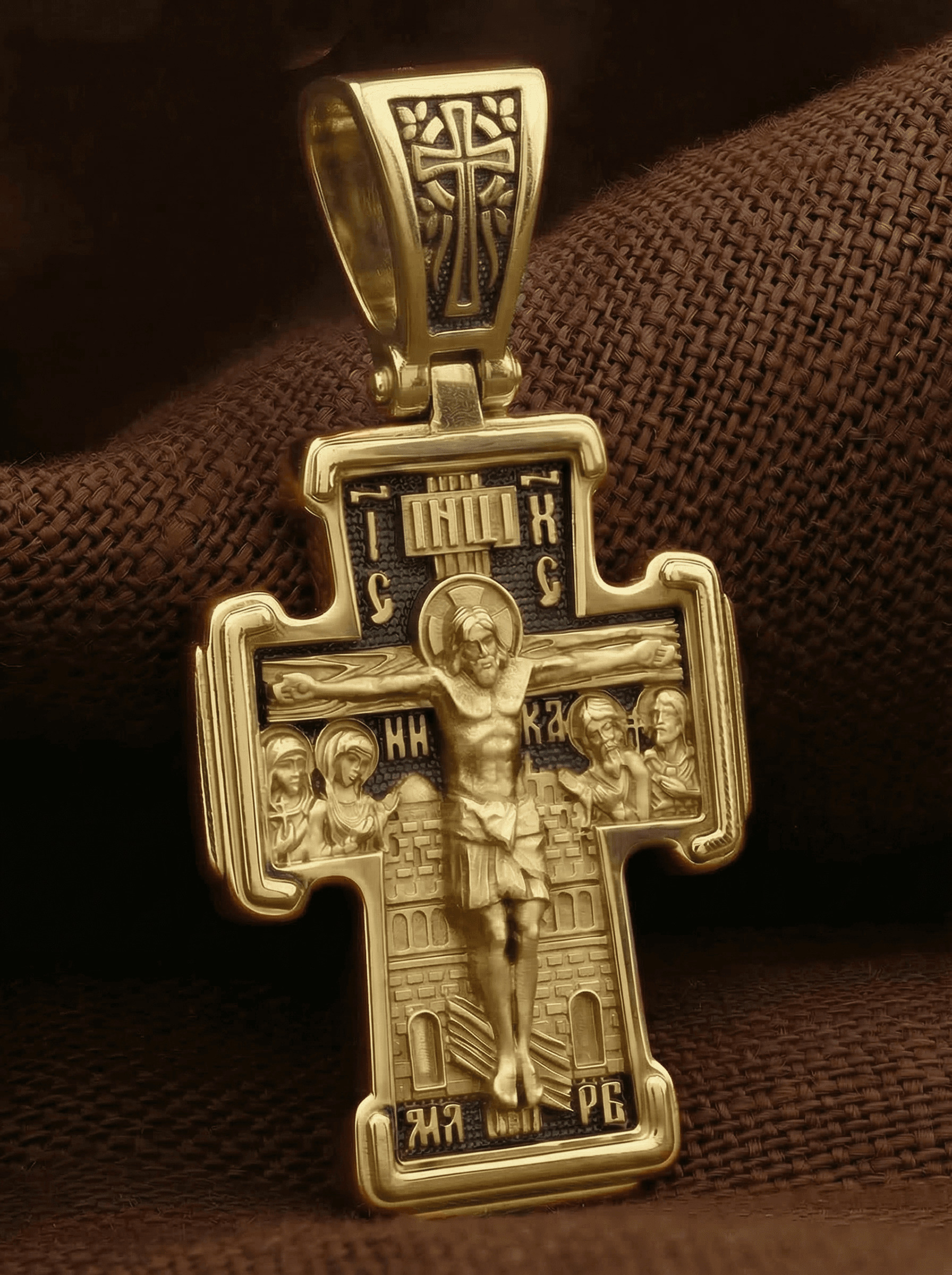 На лицевой стороне креста изображено Распятие Господа и Спасителя нашего Иисуса Христа. Крест- символ спасения и искупления рода человеческого, знамение победы над смертью и адом. Иисус Христос, как искупительная жертва освобождения человечества от власти греха, умер крестной смертью и в третий день воскрес. На верхней табличке, выше головы Иисуса, расположена надпись, составленная Понтием Пилатом — «IНЦI». Она означает «Иисус Назорей, Царь Иудейский». Рядом расположена надпись «IС» « ХС». Она означает Иисус Христос. Ниже — слово «НИКА», что означает «победитель». Слева от Распятия — Пресвятая Богородица и святая мироносица Мария Магдалина с крестом в руке. Справа — апостол и евангелист Иоанн Богослов, один из ближайших учеников Иисуса Христа, и сотник Лонгин с крестом в правой руке и копьем — в левой. За крестом высится Иерусалимская стена. Надпись «МЛРБ» — «место лобное рай бысть» означает, что место лобное стало раем, помещается в нижней части креста. На кулонном кольце помещен крест.
