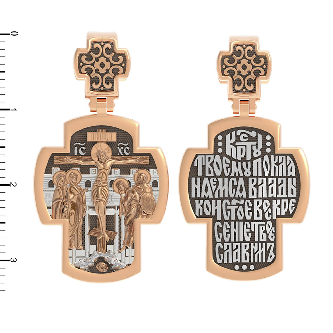 На лицевой стороне креста изображено Распятие Господа и Спасителя нашего Иисуса Христа. Своими крестными страданиями Господь смыл наши грехи, покрыл наш долг перед Богом или, на языке Писания, нас «искупил». В Голгофе сокрыта непостижимая тайна бесконечной правды и любви Бога. Крест стал символом победы добра над злом, жизни над смертью, напоминанием бесконечной Божьей любви, предметом радости. Воплотившийся Сын Божий Своею кровью освятил крест и сделал его проводником Своей благодати, источником освящения верующих. На верхней табличке, выше головы Иисуса, расположена надпись, составленная Понтием Пилатом — «IНЦI». Она означает «Иисус Назорей, Царь Иудейский». Ниже перекладины написано сокращенно имя Спасителя «IC» «XC» — Иисус Христос. Крест стоит на горе камней, символизирующих Голгофу. Под подножием Креста изображена покоящаяся голова (череп) Адама. Слева от Распятия стоят оплакивающие Господа Пресвятая Богородица и святая мироносица Мария Клеопова. Справа — апостол и евангелист Иоанн Богослов, один из ближайших учеников Иисуса Христа и сотник Лонгин. По преданию, увидя, что они горько плачут, Иисус сказал Матери Своей: «Жено! Се сын Твой!» Потом сказал ученику Иоанну: «Се мати твоя». С этого времени Иоанн взял Матерь Божию к себе, и Она жила в его доме до самой смерти.