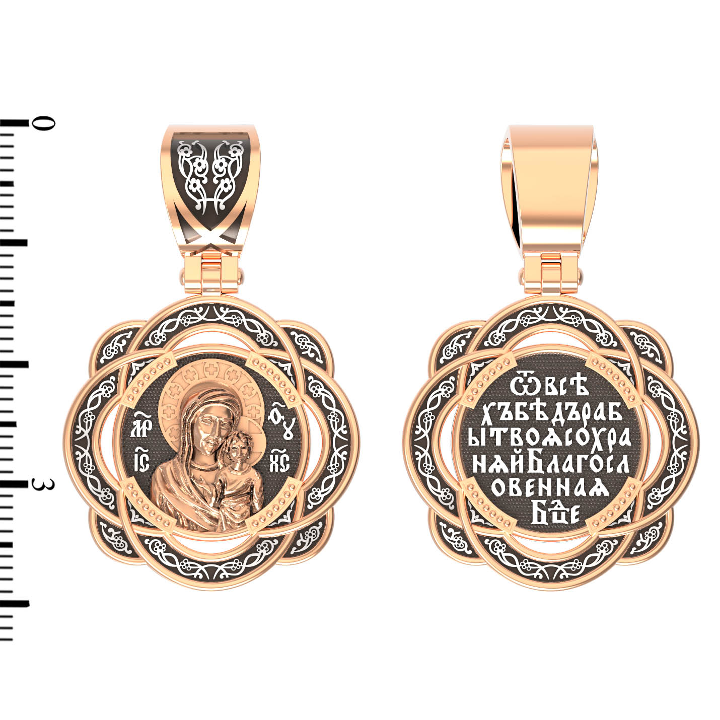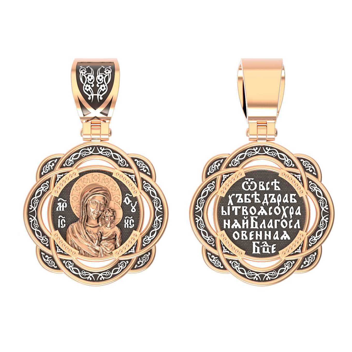 На лицевой части образка изображена Казанская икона Пресвятой Богородицы — одна из самых почитаемых в России. Икона была явлена на пожарище в Казани в 1579 году. В 1904 году святыня была похищена и уничтожена, но чудотворную силу иконы Богородица явила во многих ее списках. Молитва перед Казанской иконой Божьей Матери помогает во всех сложных случаях жизни, во всех печалях, невзгодах, скорбях.