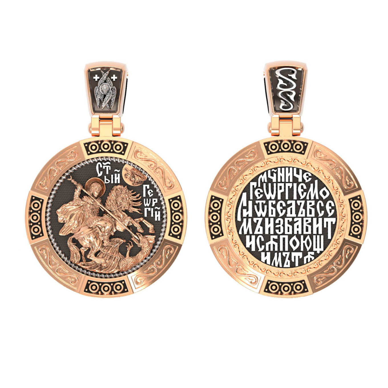 На лицевой стороне изображен Святой Георгий Победоносец. Образ Великомученика считают одним из наиболее чтимых святынь в Святыни Православных, он олицетворяет собой заступника для верующих, чья жизнь имеет какое-либо отношение к военным делам, также он может оберегать и землевладельцев. Одно из самых великих чудес, которое сотворил Великомученик — это спасения всего города от устрашающего змия. Молитвами и своей непреклонной верой, взываемой к Всевышнему, он смог одолеть чудовище. Святой убил змея, спас жителей и их души от влияния дьявола, породив в них надежду и веру в Господа, призывая людей принять христианскую веру. Поскольку при жизни св. Георгий был военным, он считается покровителем всех, кто имеет отношение к армии — военнослужащим, участникам боевых действий. Молитва перед иконой Георгия Победоносца поможет защититься от врагов, одержать победу в сражении (военном, спортивном, духовной брани с дьяволом), содействие в установлении мира между членами семьи, избавиться от телесного недуга. На кулонном кольце изображен шестикрылый Серафим — самый приближенный к Господу Ангел.