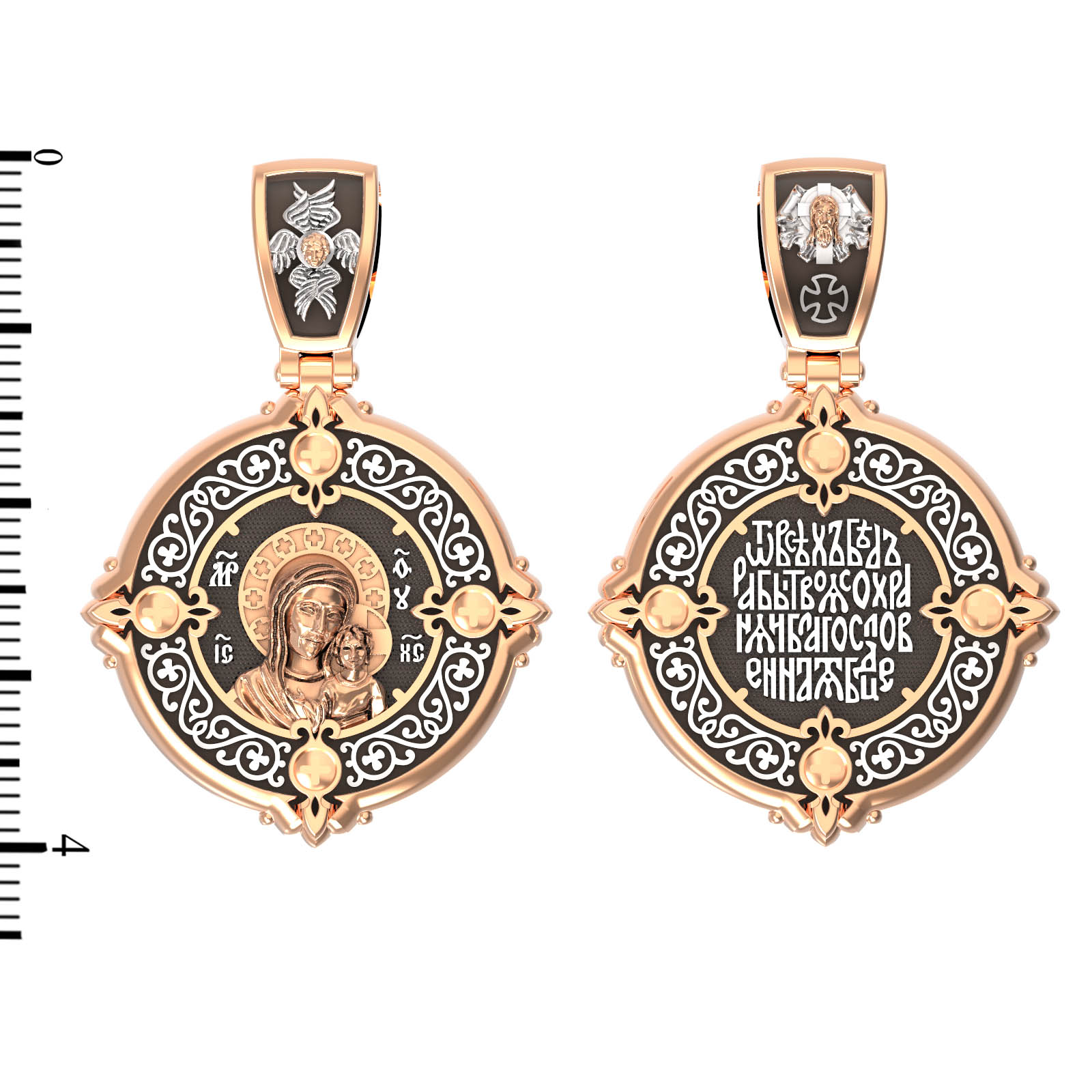 На обороте написана молитва к Богородице: «От всех бед рабы Твоя сохраняй, Благословенная Богородица!». На кулонном кольце изображен Спас Нерукотворный — Символ вочеловечившегося Божества и шестикрылый Серафим — самый приближенный к Господу Ангел.