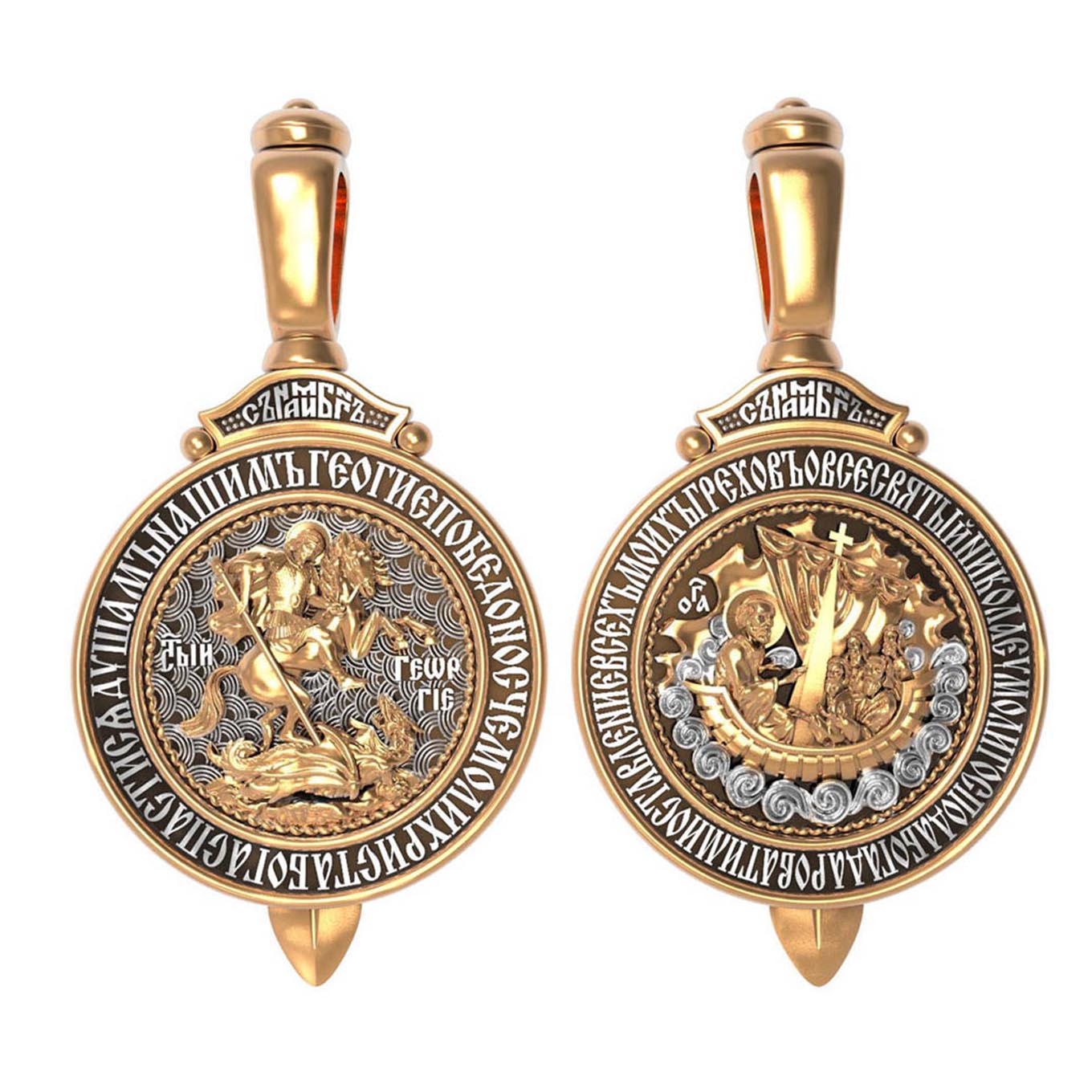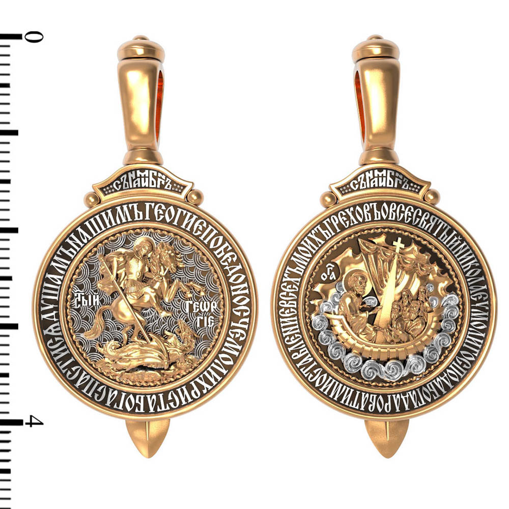 Основой композиции лицевой стороны является изображение Святого Георгия Победоносца. Святой Георгий один из наиболее почитаемых святых в Христианской Церкви. На Руси он известен как Юрий или Егорий, покровитель воинов, помощник в крестьянском труде. На образке изображено самое знаменитое чудо святого: спасение принцессы от змея, которому она предназначалась в жертву. Чудо это имеет символическое толкование. Принцесса означает душу человеческую, а змей — дьявола, желающего ее поглотить. Святой Георгий, небесный защитник, спускается с Небес, чтобы помочь душе избавиться от гибели. По контуру образка написана молитва: «Геогрие Победоносче, моли Христа Бога спастися душам нашим».