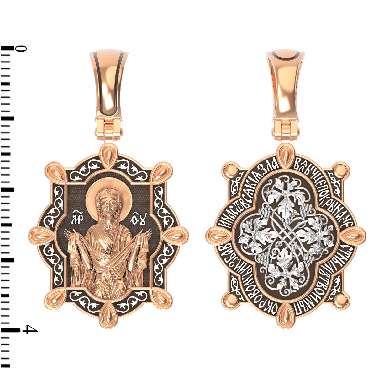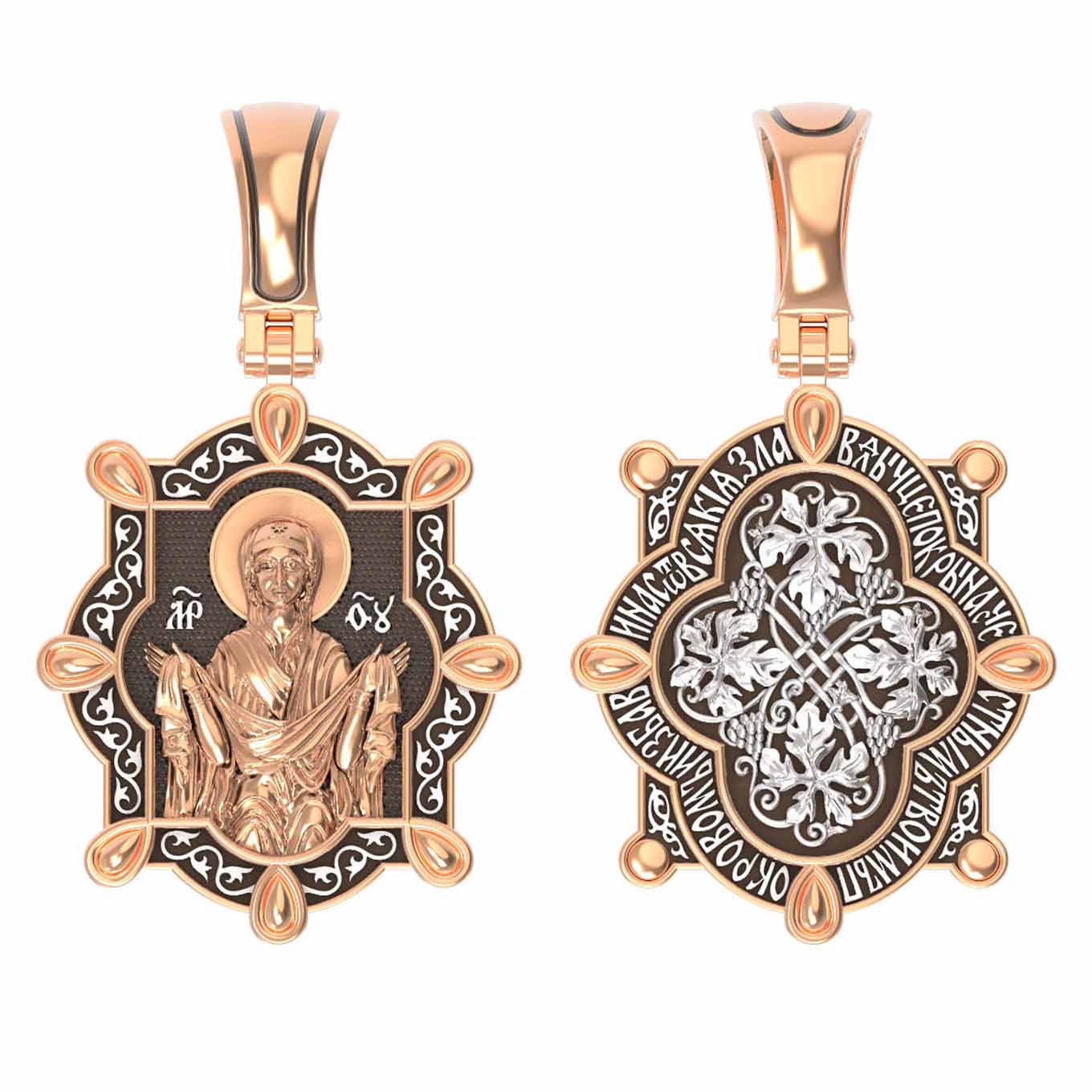 На лицевой части образка изображена икона Покров Пресвятой Богородицы. Праздник Покрова Божией Матери является воспоминанием чуда, которое произошло во Влахнернской церкви 1 (14) октября 910 года: Пресвятая Богородица явилась верующим над алтарем храма и распростерла над ними Свое покрывало. В этот день Божья Матерь открыла людям, что Она является Ходатаицей за них перед Богом. Богородица простирает Свой молитвенный покров над всеми православными христианами и умоляет Сына Своего о даровании вечного спасения каждому человеку.