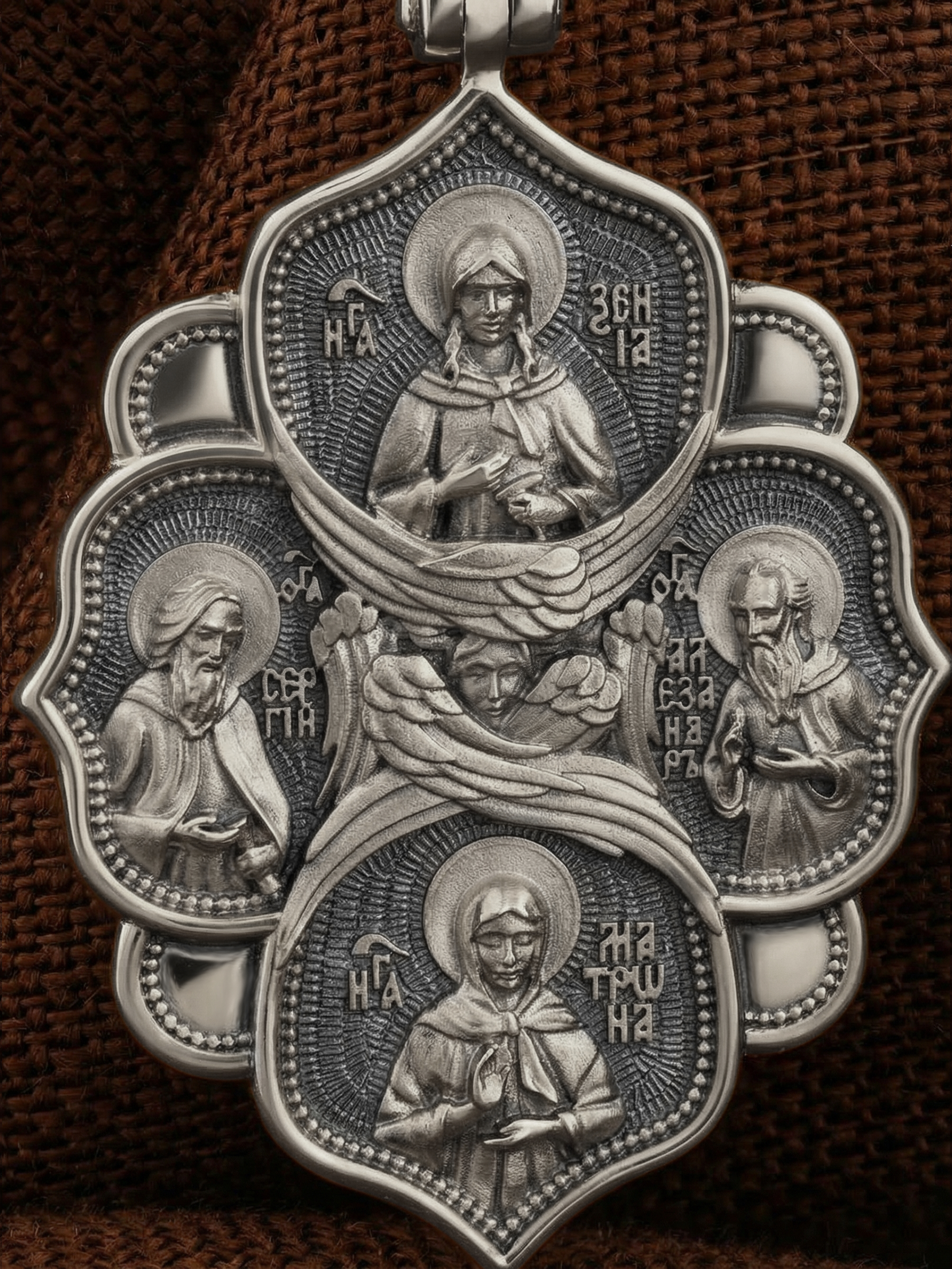 На обороте образка изображены четверо возлюбленных Богом угодников. Слева от Серафима изображен прп. Сергий Радонежский. Этот святой начал свой путь к Богу отшельником в Радонежских лесах, где основал монастырь, ставший духовным центром Руси. Он исцелял больных, которых ему привозили отовсюду, и даже воскресил отрока.