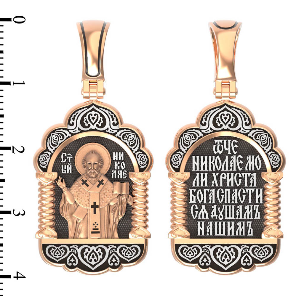 На лицевой стороне образка изображен Святитель Николай архиепископ Мир Ликийских, Чудотворец. Он является одним из самых почитаемых святых в православном мире. Святитель Николай родился во второй половине III века в Малой Азии в Ликийском городе Патары. С рождения Божий Угодник проявлял необыкновенные дарования. Сохранилось Предание, что во время крещения он, никем не поддерживаемый, простоял в купели три часа. Приняв сан священника, святитель Николай стал проводить еще более строгую подвижническую жизнь. Из­бран­ник Бо­жий Ни­ко­лай стал вершиной всех доб­ро­де­те­лей, подня­той до рай­ской вы­со­ты. С кем из ве­ли­чай­ших пра­вед­ни­ков не срав­нял­ся он об­ра­зом ду­хов­ной кра­со­ты, ко­му из них не по­сле­до­вал в сво­их де­я­ни­ях и чудотворениях? Вся жизнь святого Николая — это служение Богу. Много великих и преславных чудес сотворил великий Святитель Николай Угодник. Он помогал сущим в бедах, укрощал штормы, спасал от потопления и выносил на сушу из глубины морской, освобождал из плена и приносил освобожденных домой, избавлял от уз и темницы, защищал от посечения мечом, освобождал от смерти и подавал многим различные исцеления, слепым прозрение, хромым хождение, глухим слух, немым дар слова.