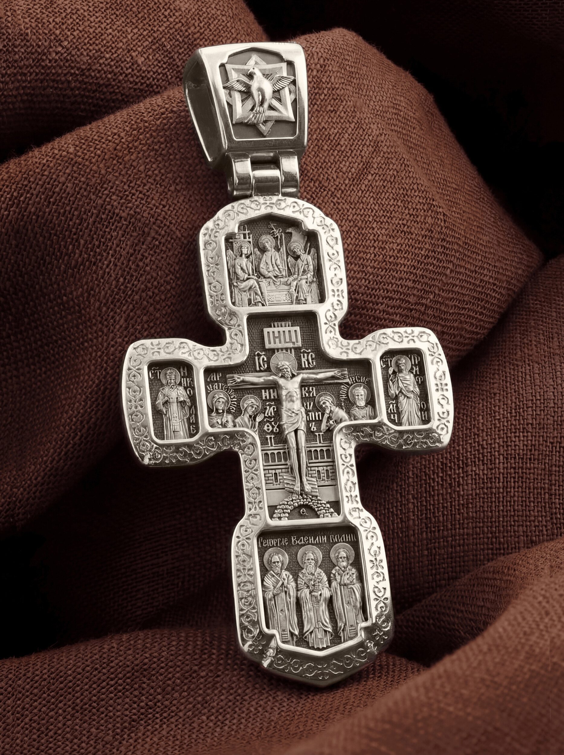 Центральную часть лицевой стороны занимает Распятие Господа Иисуса Христа с предстоящими Ему святыми, которые, по преданию, находились у Креста Господа во время Его казни. Слева — Пресвятая Богородица и жены-мироносицы — равноапостольная Мария Магдалина и святая Мария Клеопова, справа — праведный Иосиф Аримофейский и мученик Лонгин Сотник. Над Распятием помещена икона Святой Троицы. Ангелы сидят за трапезным столом вокруг чаши, которая символизирует грядущую жертву Второго Лица Пресвятой Троицы, Бога Сына. Слева от Господа находится святой Николая Чудотворец, справа — святой мученик.