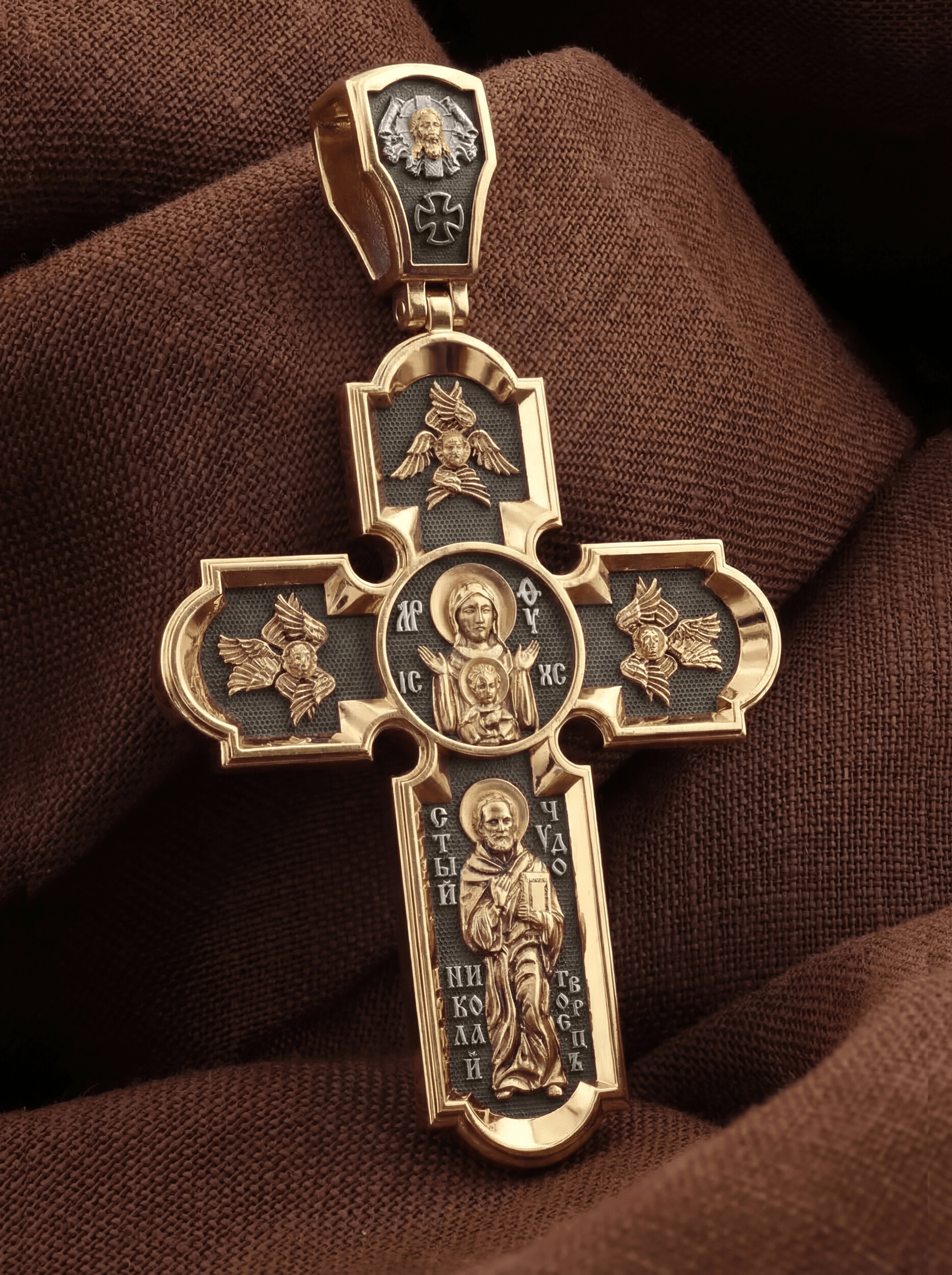 У основания креста в полный рост изображен самый любимый святой Православной Церкви — Николай Чудотворец. Святой почитается как целитель болезней, покровитель путешествующих, особенно по морю, помощник в торговле, учебе, а также в поисках достойного супруга.