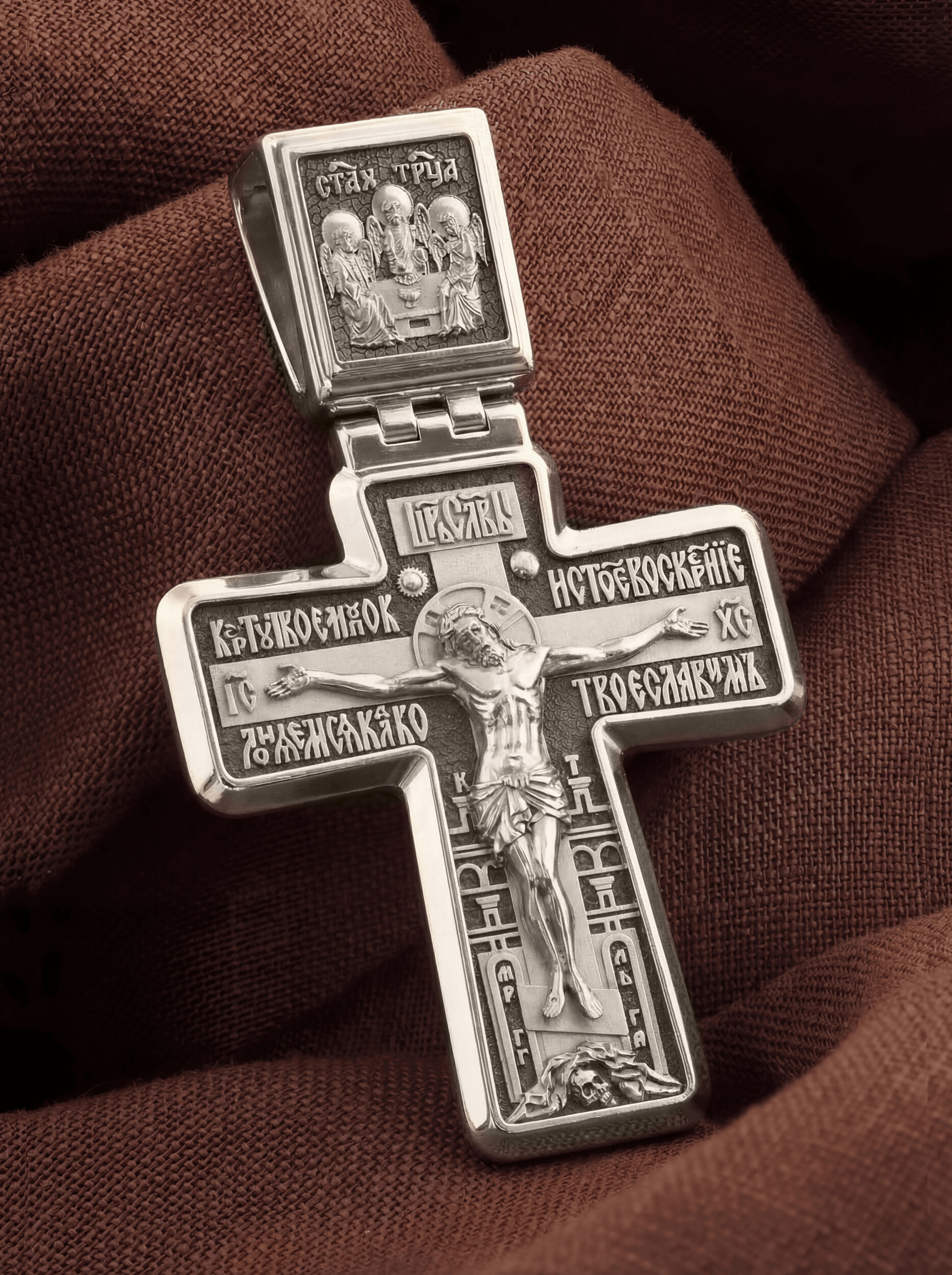 На лицевой стороне креста изображено Распятие Иисуса Христа. Позади Его изображена иерусалимская стена, знак того, что Господь был распят вне стен города. Но вместе с тем стена знаменует и Небесный Иерусалим, путь в который открылся для человечества через Голгофу: «МЛРБ», «Место Лобное Рай Бысть» — написано у ее основания. Рядом с Его образом помещены слова «Царь Славы». Эти слова характеризуют Господа как Великого Архиерея, победителя смерти. Верхняя перекладина символизирует титло — табличку, на которой, согласно Евангелию, было начертано: «Иисус Назорей Царь Иудейский» (IНЦI). Также Распятие сопровождается надписями, олицетворяющими Христа. Это святое имя Христа «IC» (Иисус) «ХС» (Христос), и словосочетание «Сын Божий», а так же написан тропарь Животворящему Кресту: «Кресту Твоему поклоняемся, Владыко, и святое воскресение Твое славим». Распятие стоит на горе камней, символизирующих Голгофу, в основании которой различается череп. Это голова Адама. На кулонном кольце помещено изображение Святой Троицы.