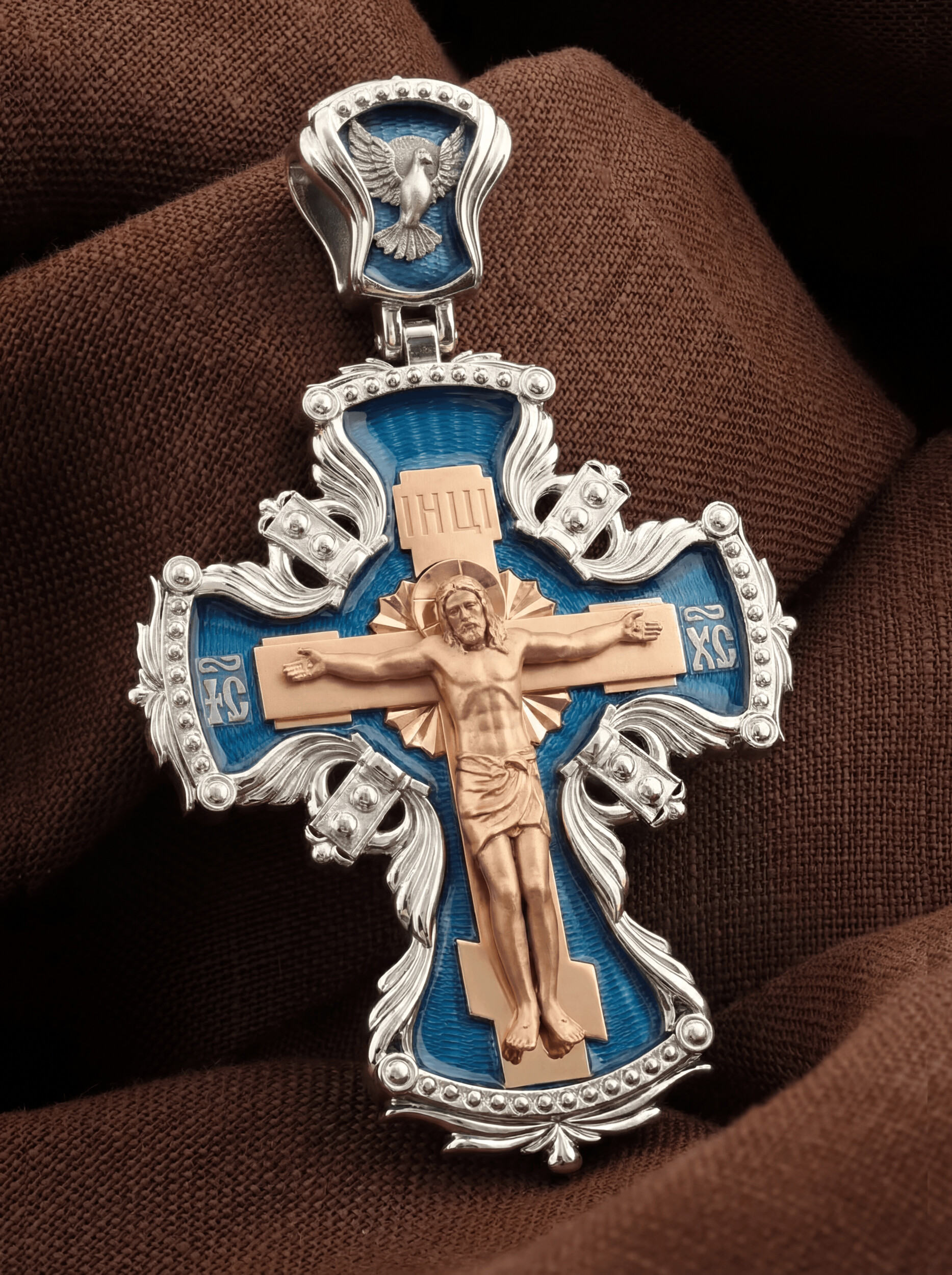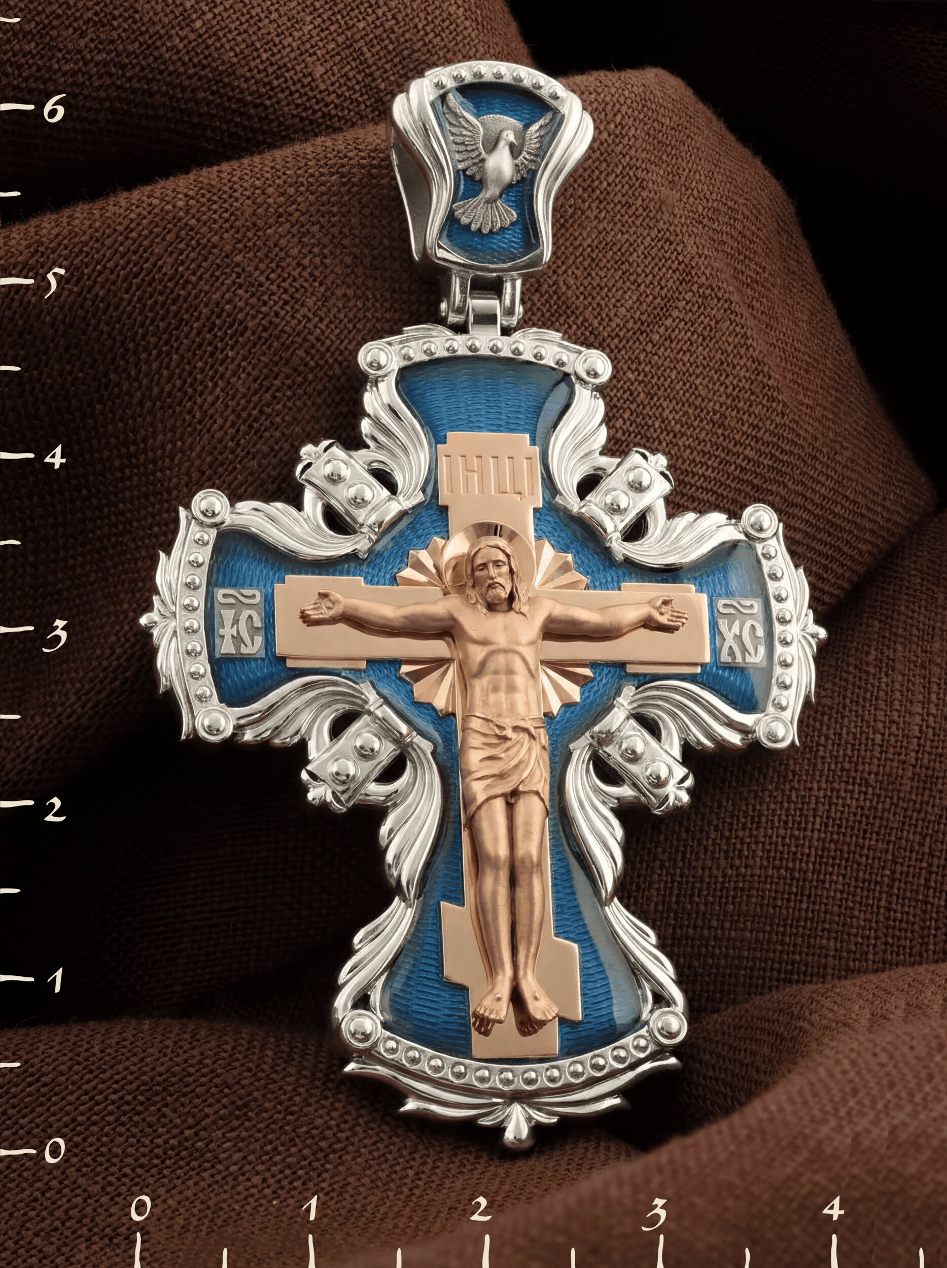 Центральную часть лицевой стороны занимает Распятие Христа — образ жертвы, принесенной Господом за грехи людей. Именно ко Христу, сошедшему на землю ради нашего спасения, возносятся все молитвы. Рядом с Его образом помещены слова — «НИКА» и «СЫН БОЖИЙ». Эти слова характеризуют Господа как Великого Архиерея, победителя смерти. Также Распятие сопровождается надписями, олицетворяющими Христа — это святое имя Христа «IC» (Иисус) «ХС» (Христос). На кулонном кольце изображен голуь — символ Святого Духа.