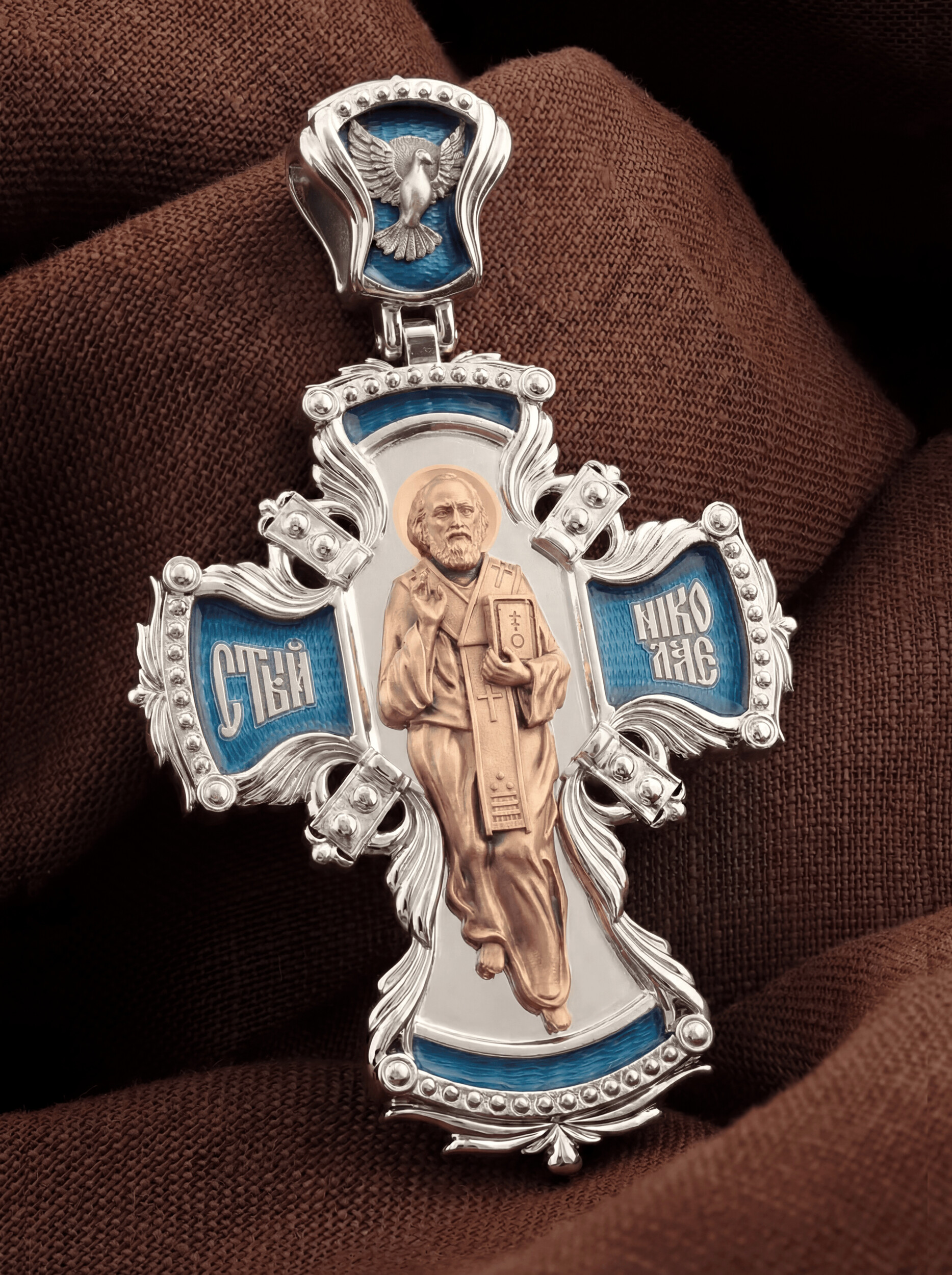 Оборотную сторону креста возглавляет икона святителя Николая Чудотворца, самого почитаемого святого не только в России, но и во всем мире. Николай Чудотворец, помощник в делах, защитник путешествующих, покровитель учащихся, утешитель обиженных и нуждающихся, целитель самых страшных и тяжелых недугов, предстатель и молитвенник за людей перед Богом. На кулонном кольце помещено изображение Спаса Нерукотворного — образ Спасителя, который Он запечатлел на плате и передал для исцеления больному проказой царю Эдессы.