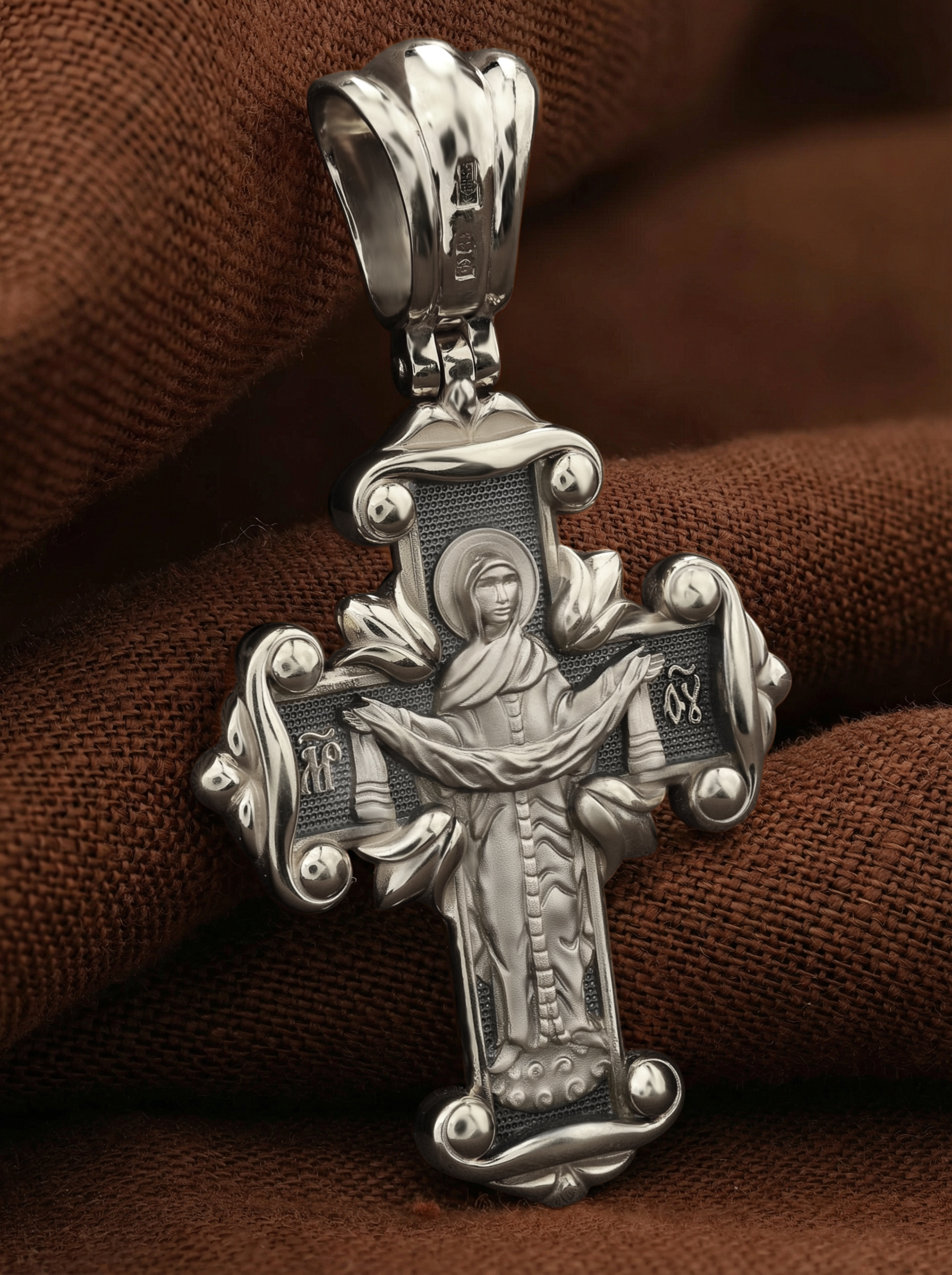 На оборотной стороне креста изображена икона Божией Матери «Покров Пресвятой Богородицы». Праздник Покрова Пресвятой Богородицы пришел на Русь в XII веке из Византии и стал одним из самых почитаемых. В 910 году Византийской Империи угрожали нападением сарацины. Не видя ниоткуда помощи, в те дни греки во множестве стекались в Константинополь, во Влахернский храм, в котором хранились риза Богоматери и Ее головной покров, и молились. 1 (14) октября 910 года Святому Андрею Юродивому и его ученику Епифанию было видение Покрова Божией Матери. Пресвятая Богородица, в окружении Святых, явилась над алтарем Храма и слезно молилась. По окончании молитвы сняла с Себя блистающее великое и страшное покрывало, которое носила на Пречистой главе Своей и, держа его с великой торжественностью, распростерла над всем стоящим народом. Вскоре враги без всякого кровопролития отступили от города. Богородица простирает Свой молитвенный покров над всеми православными христианами и умоляет Сына своего о даровании вечного спасения каждому человеку.